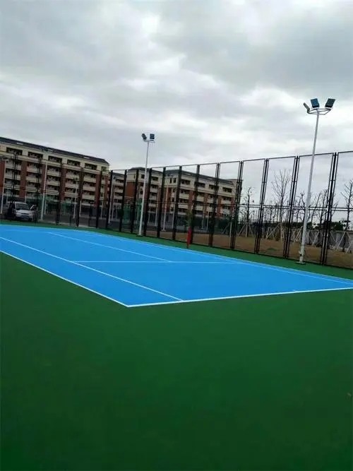 目前丙烯酸球场地的流行做法主要有:草地场地、硬地场地和红土场地。底层一般以沥青混凝土为基础,而场地的区分主要按面层材料的不同。目前球场面层的主要做法有草皮、红土地、丙烯酸球场(硬地丙烯酸/弹性丙烯酸)涂料等。首先,由于天然草的养护难度大,费用高,尤其在中国北方四季温差很大,所以很少采用。其次,红土场地球场除了专业队以外,一般训练比赛很少采用。再次,硬地场地的面层采用丙烯酸涂料,目前流行的硬地球场(美、澳)主要采用丙烯酸涂料。这种涂料可以在沥青或混凝土底基上使用。根据硬度及球速不同,可分为硬地和软垫弹性两个系列。硬地系列主要构造为:粘合层、纹理层、表面色彩层和漆线。而软垫系列则是在粘合层与纹理层之间加入粗、细各一层的橡胶层。