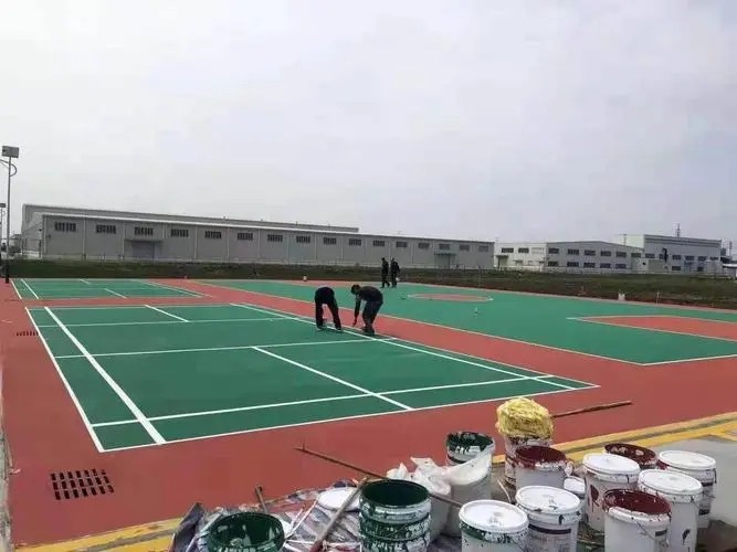 用丙烯酸弹性材料铺装球场面层(可做成绒面或细颗粒状),一般制作4mm厚,由于其特殊的物理性能和合适的弹性(现场可调),对运动员的腿部关节能起到很好的保护作用。适用于球爱好者健身及比赛。