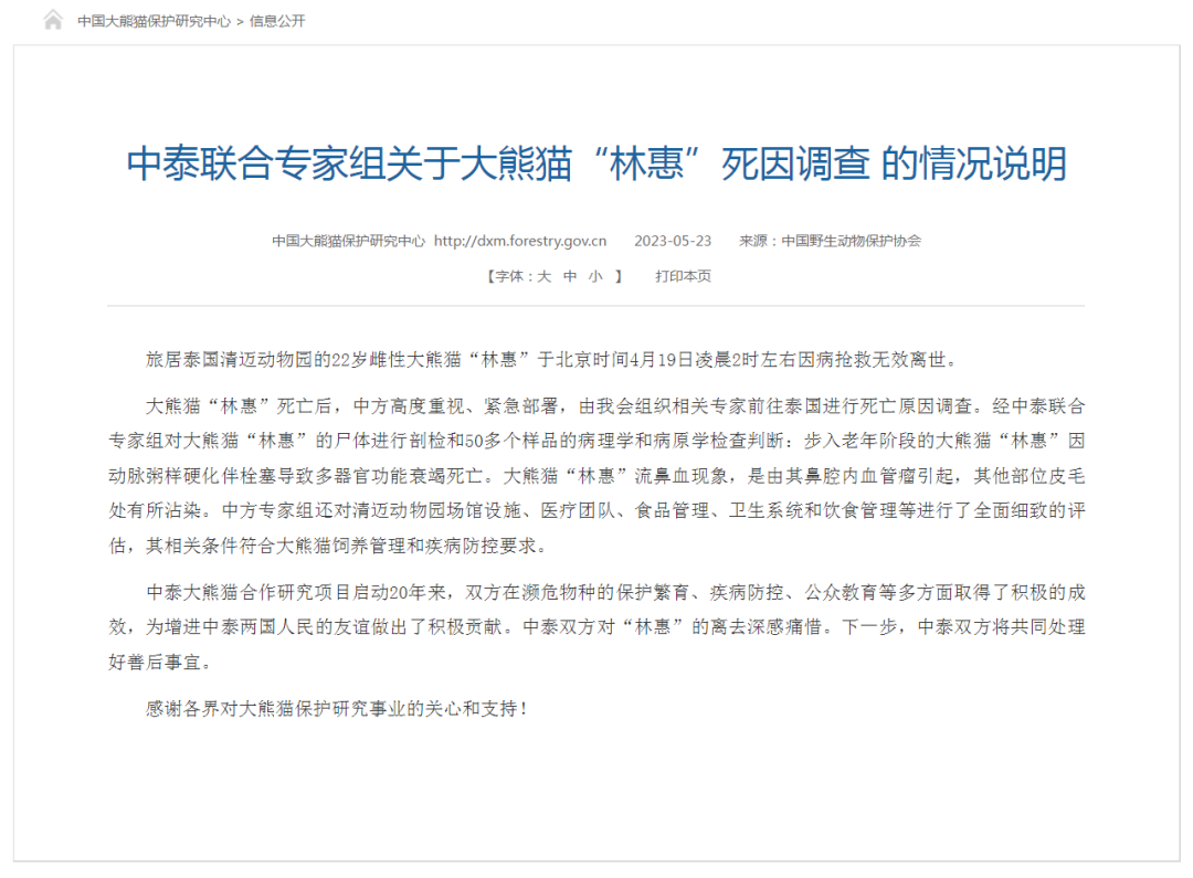 5月23日,中国野生动物保护协会发布《中泰联合专家组关于大熊猫“林惠”死因调查的说明》: