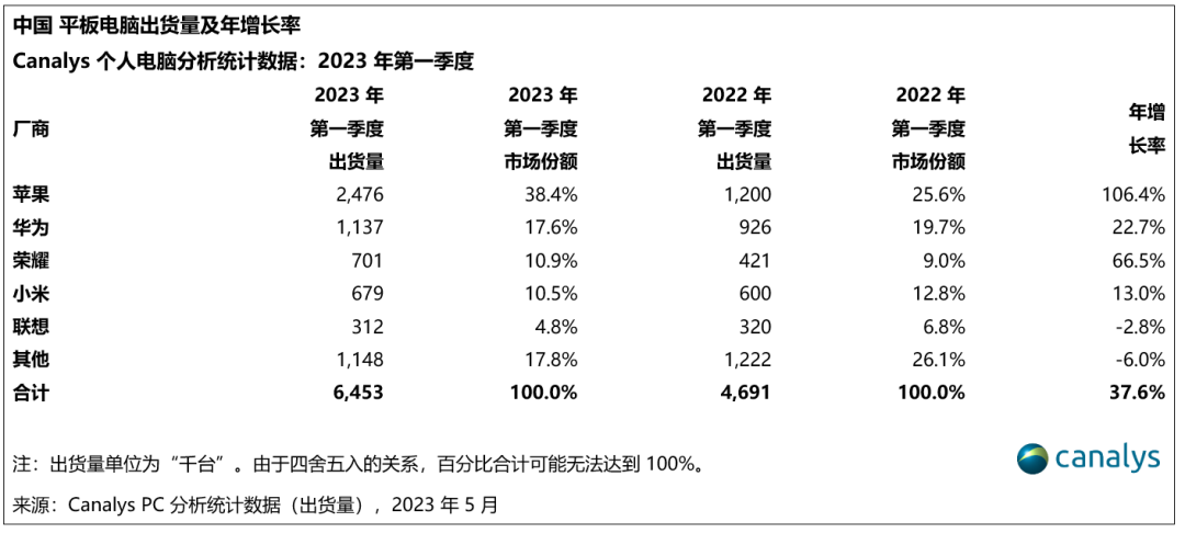 C114讯 5月24日,2023年第一季度,中国大陆个人电脑(台式机、笔记本、工作站)出货量同比下降 24%至890万台。台式机(包括台式工作站)出货量下降28% 至 280 笔记本电脑(包括移动工作站)出货量下降22%至610万台。平板电脑出货逆势上升,总出货量同比增长38%至650万台。