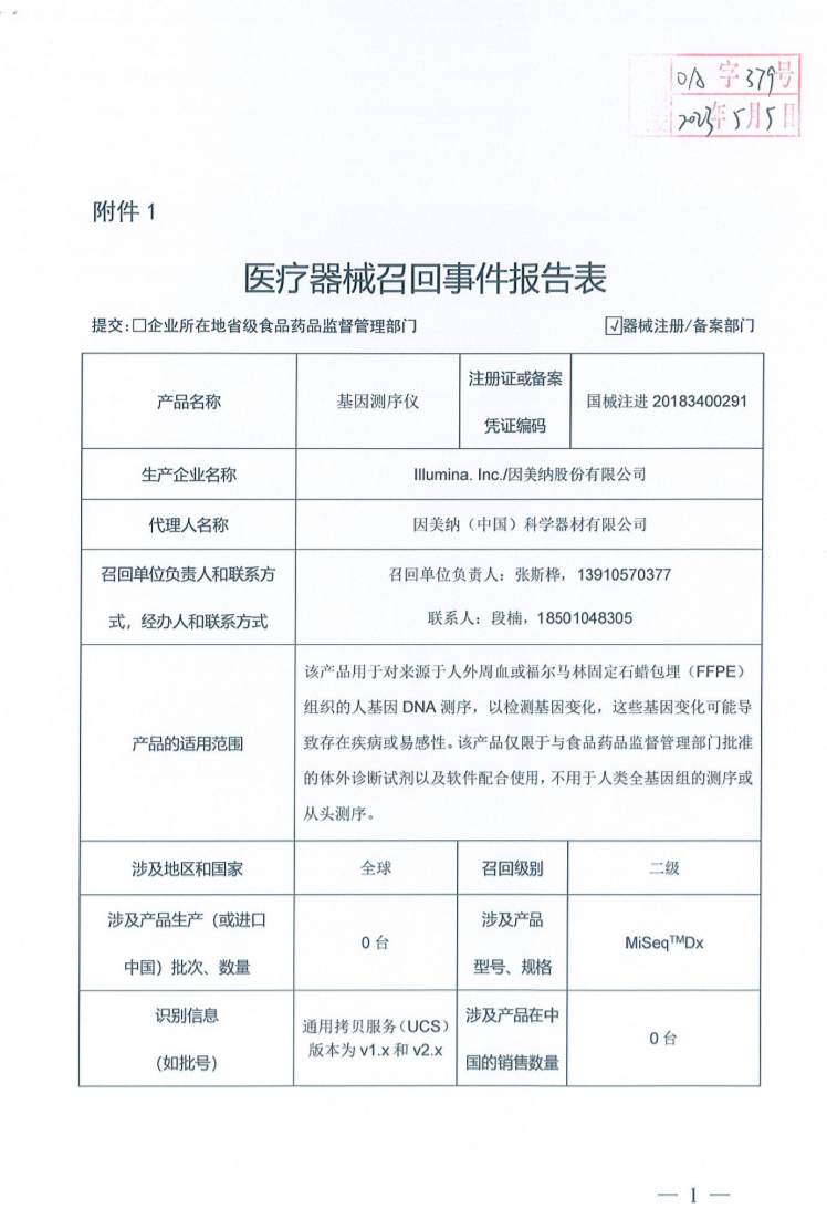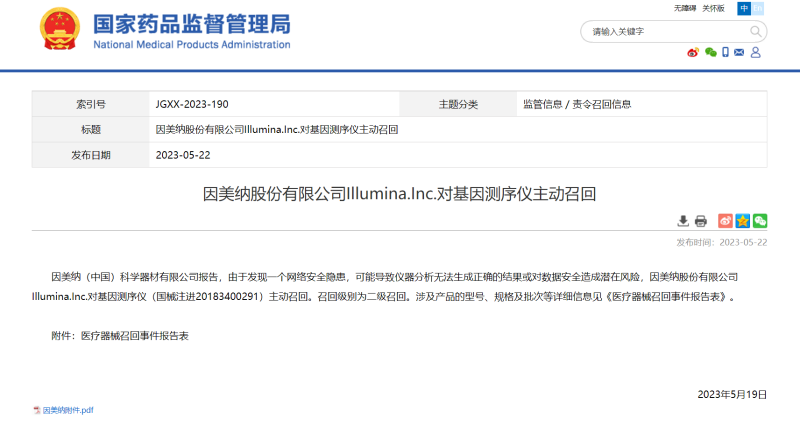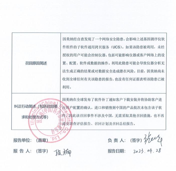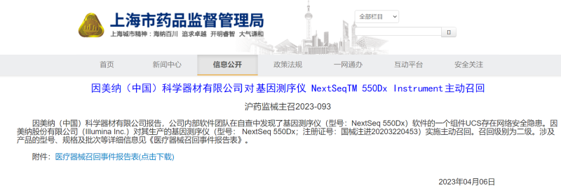 2023年4月6日,上海市药品监督管理局官网发布召回公告,称美纳基因测序仪(型号:NextSeq 550Dx)软件的组件UCS存在网络安全风险,可导致未经授权的用户远程控制仪器,改变设置、配置、软件或数据,或影响临床诊断仪器中的患者测试结果,包括导致仪器不提供或提供不正确的结果、变化的结果或数据泄露。共有969个产品涉及召回,其中中国有277个。