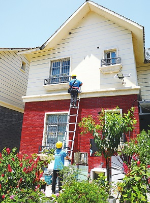 图为移动人员在成都市新津区兴义镇广滩村为居民安装移动宽带和摄像头。