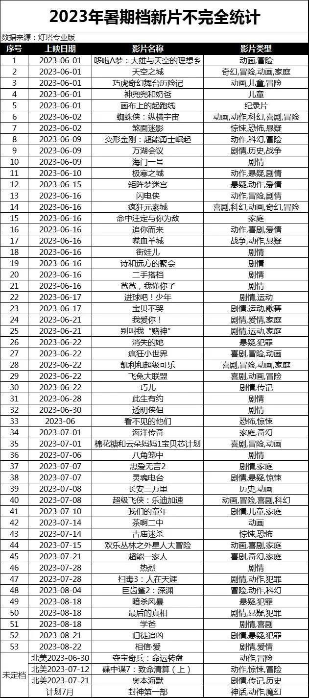 今年的暑期档似乎比我们想象的要平淡。截至5月23日,2023年暑期档上映的新片只有53部,平均每月只有10多部。这种规模的新片供应量甚至不到一个普通的淡季。