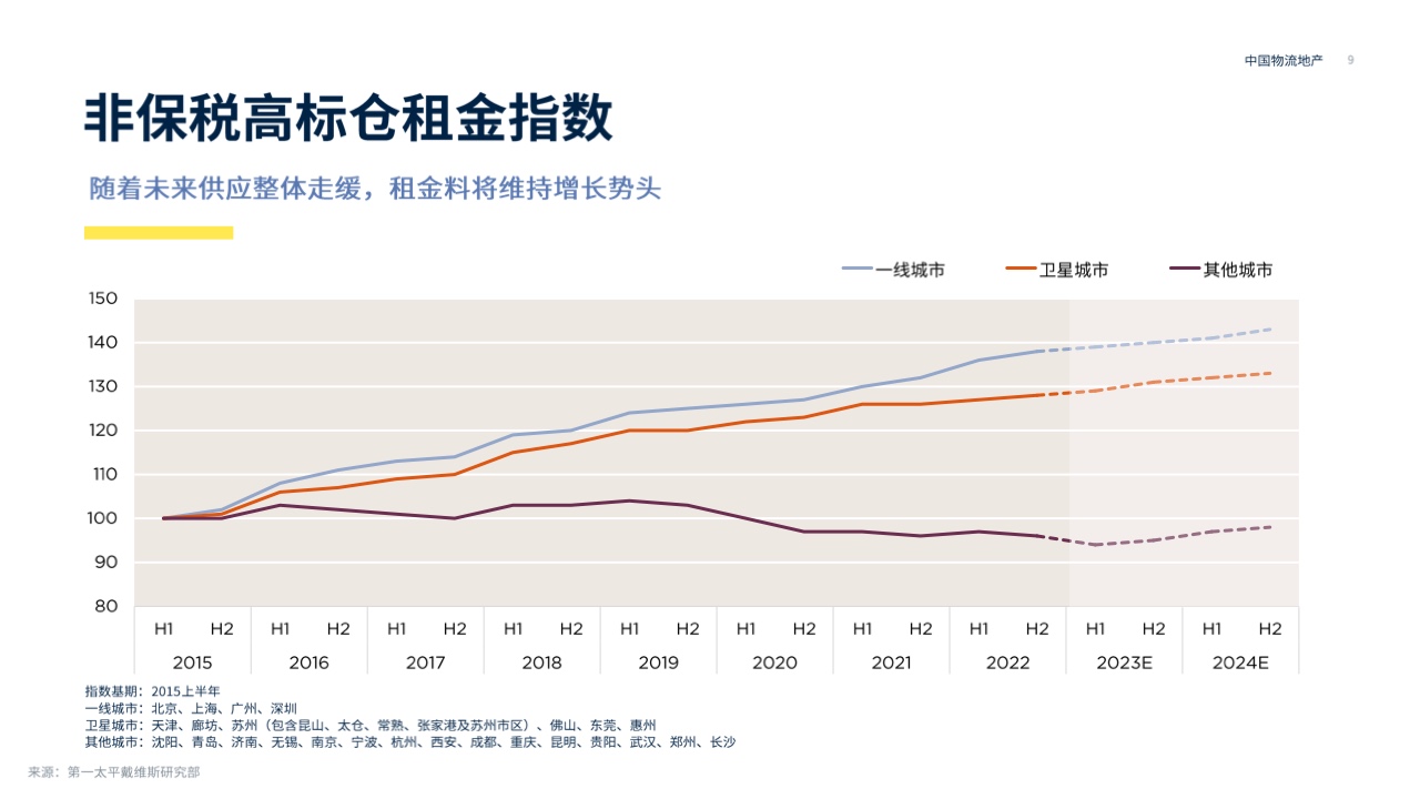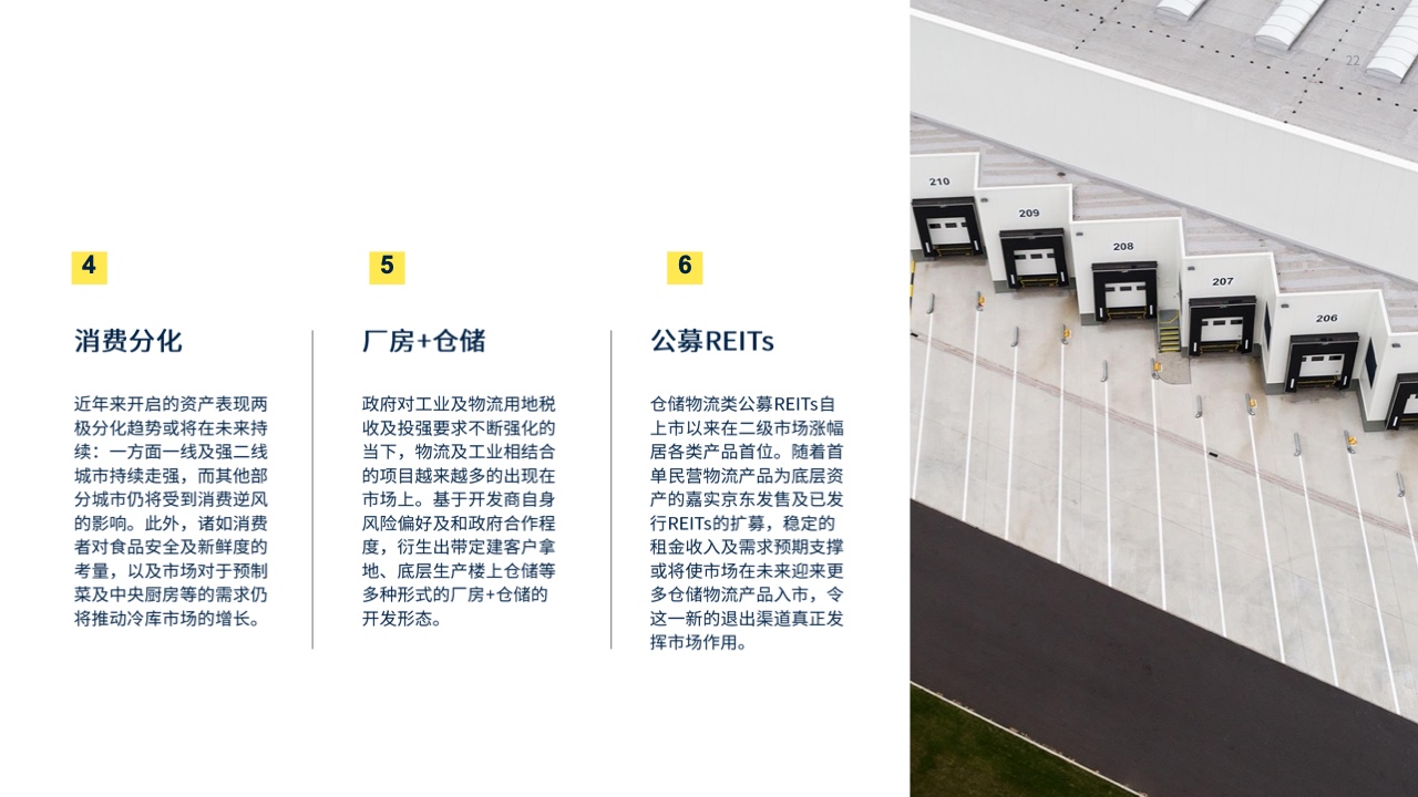 近年来的两极分化可能在未来继续:一方面,一线和强大的二线城市的资产表现继续走强,而其他城市仍将受到消费逆风的影响。此外,消费者对食品安全和新鲜度的考虑,以及市场对预制蔬菜和中央厨房的需求,仍将促进冷库市场的增长。