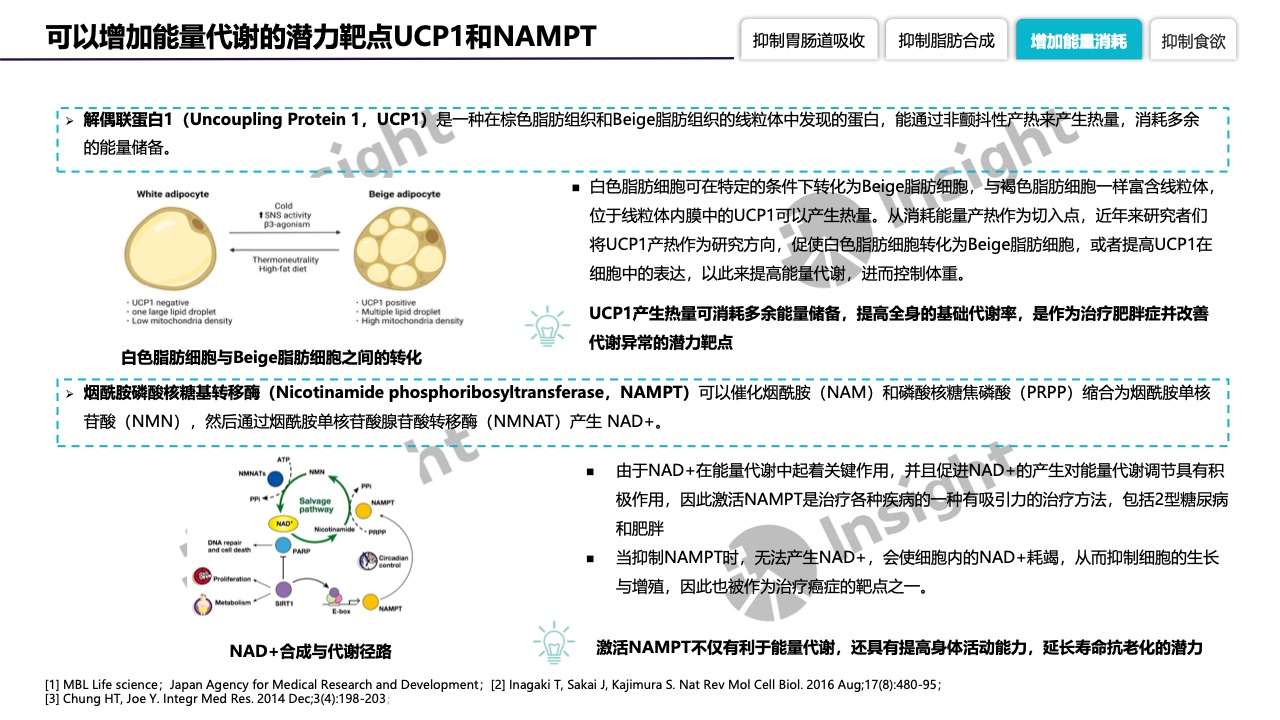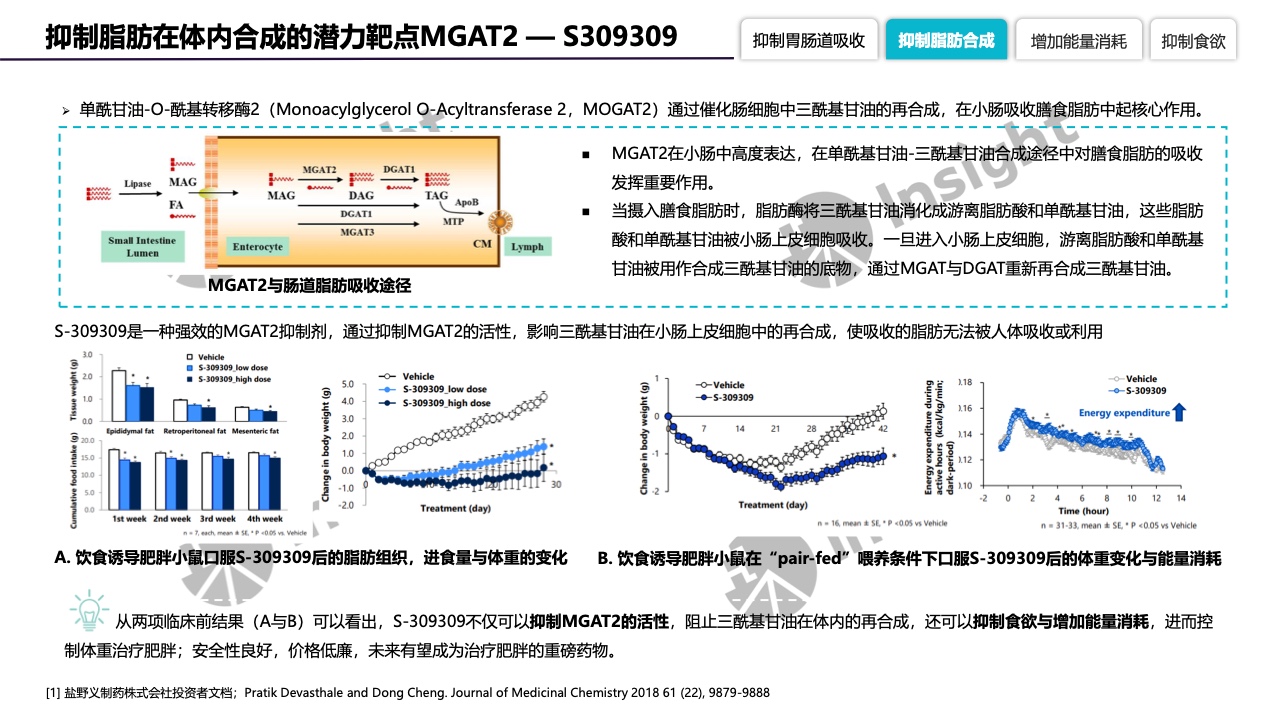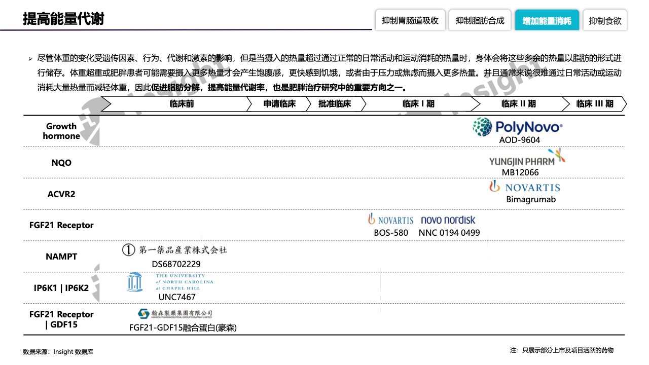 肥胖的发生和发展涉及能量吸收、代谢、储存和消耗的生理过程,包括抑制消化酶活性和体内脂肪合成等多个具有成药潜力的靶点 DGAT1 和 MGAT2、能量代谢的靶点增加 FGFR21、UCP1 和 NAMPT,以及抑制食欲的靶点。