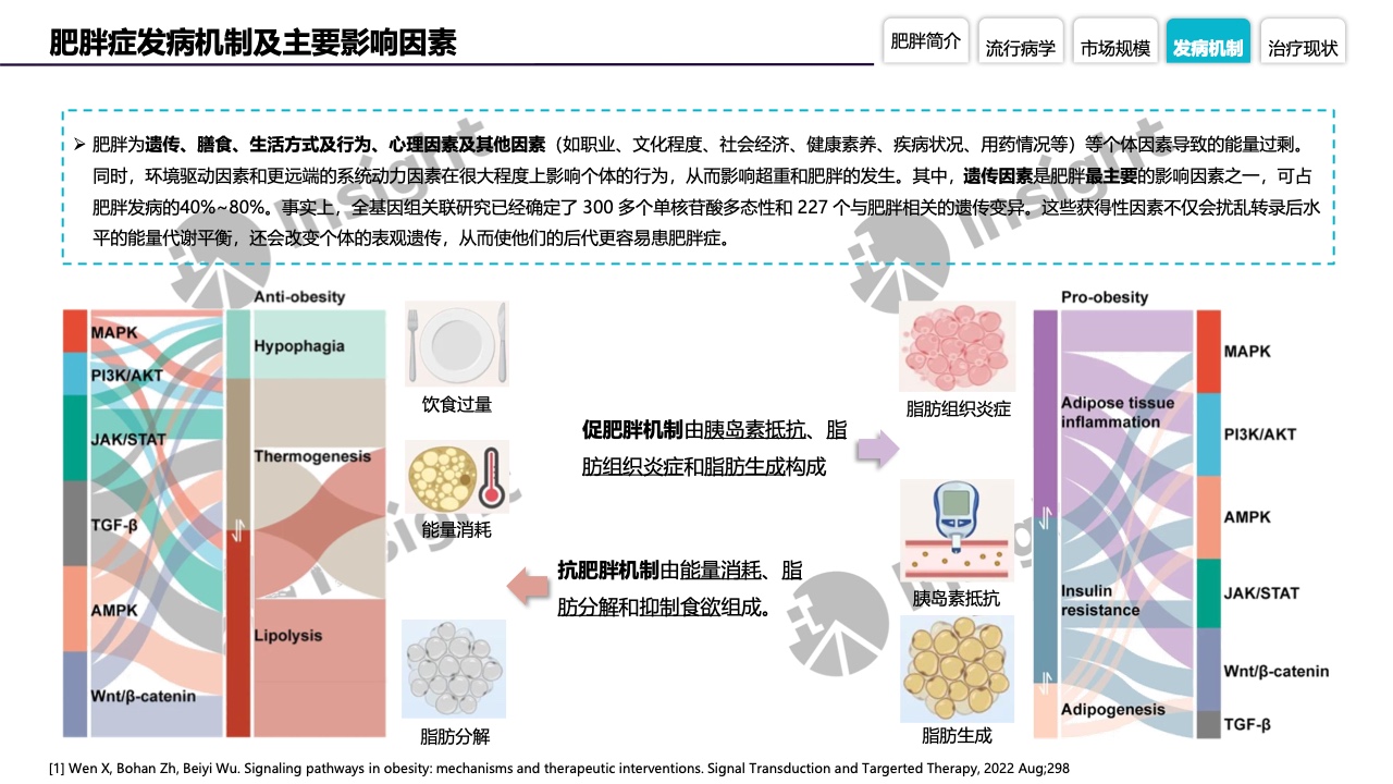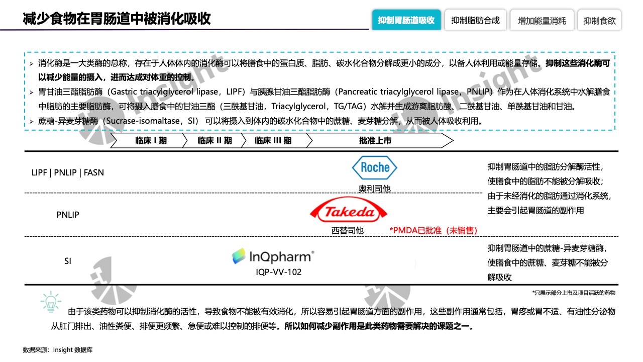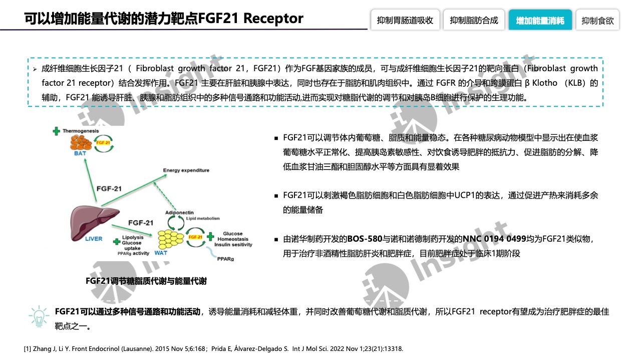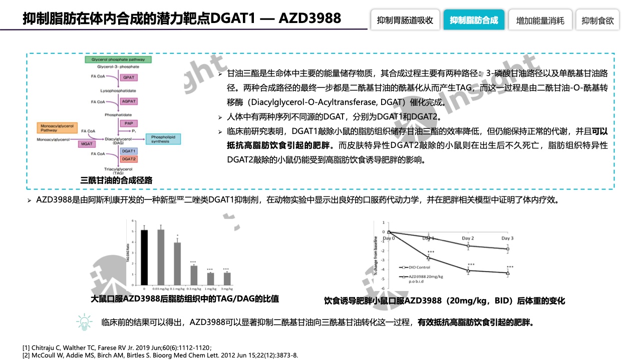 肥胖的发生和发展涉及能量吸收、代谢、储存和消耗的生理过程,包括抑制消化酶活性和体内脂肪合成等多个具有成药潜力的靶点 DGAT1 和 MGAT2、能量代谢的靶点增加 FGFR21、UCP1 和 NAMPT,以及抑制食欲的靶点。