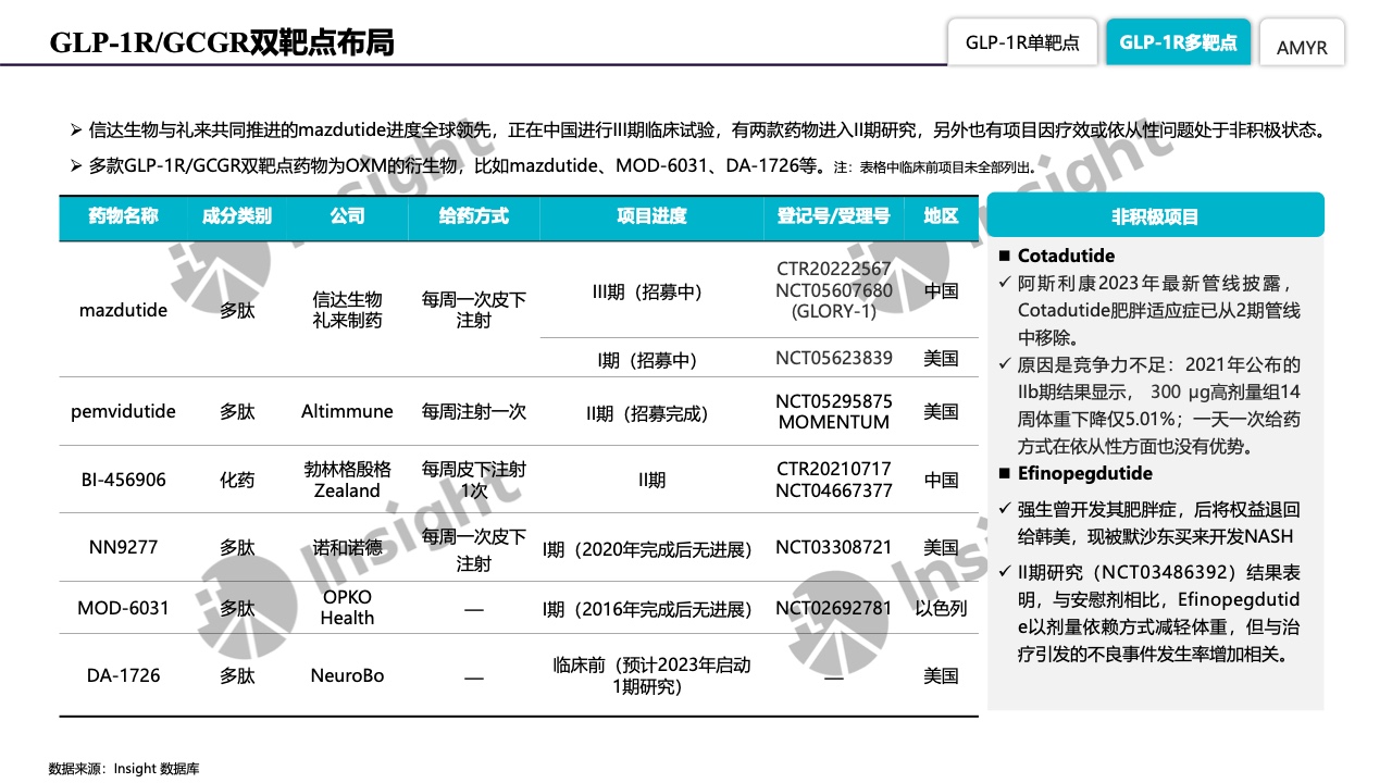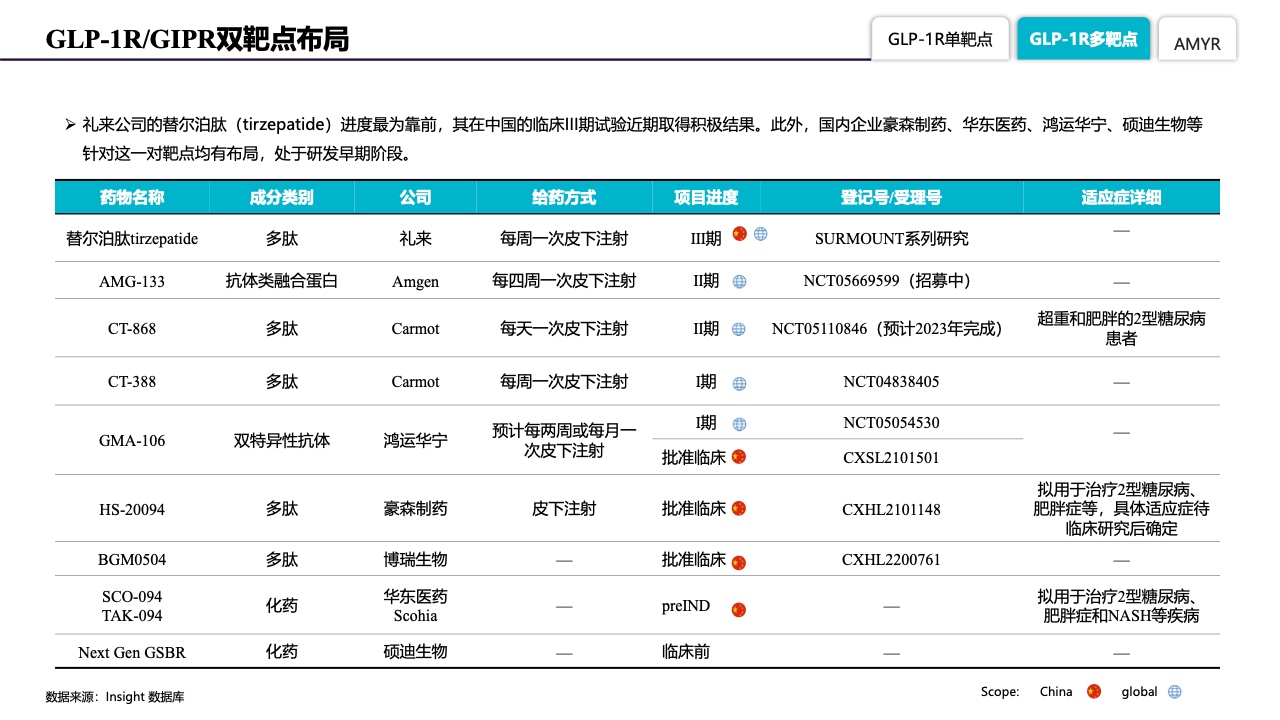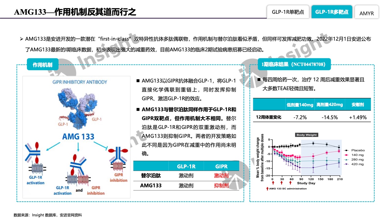 在 GLP-1R/GIPR 在双靶点领域,礼来替尔泊肽在中国的临床实践进展最高 III 最近,期测试取得了积极的结果。AMG133 是安进开发的潜在潜力「first-in-class」虽然双特异性抗体多肽偶联物的作用机制似乎与替尔泊肽矛盾,但它的作用机制似乎与替尔泊肽矛盾 I 临床数据显示,该药物也能起到减肥的作用。