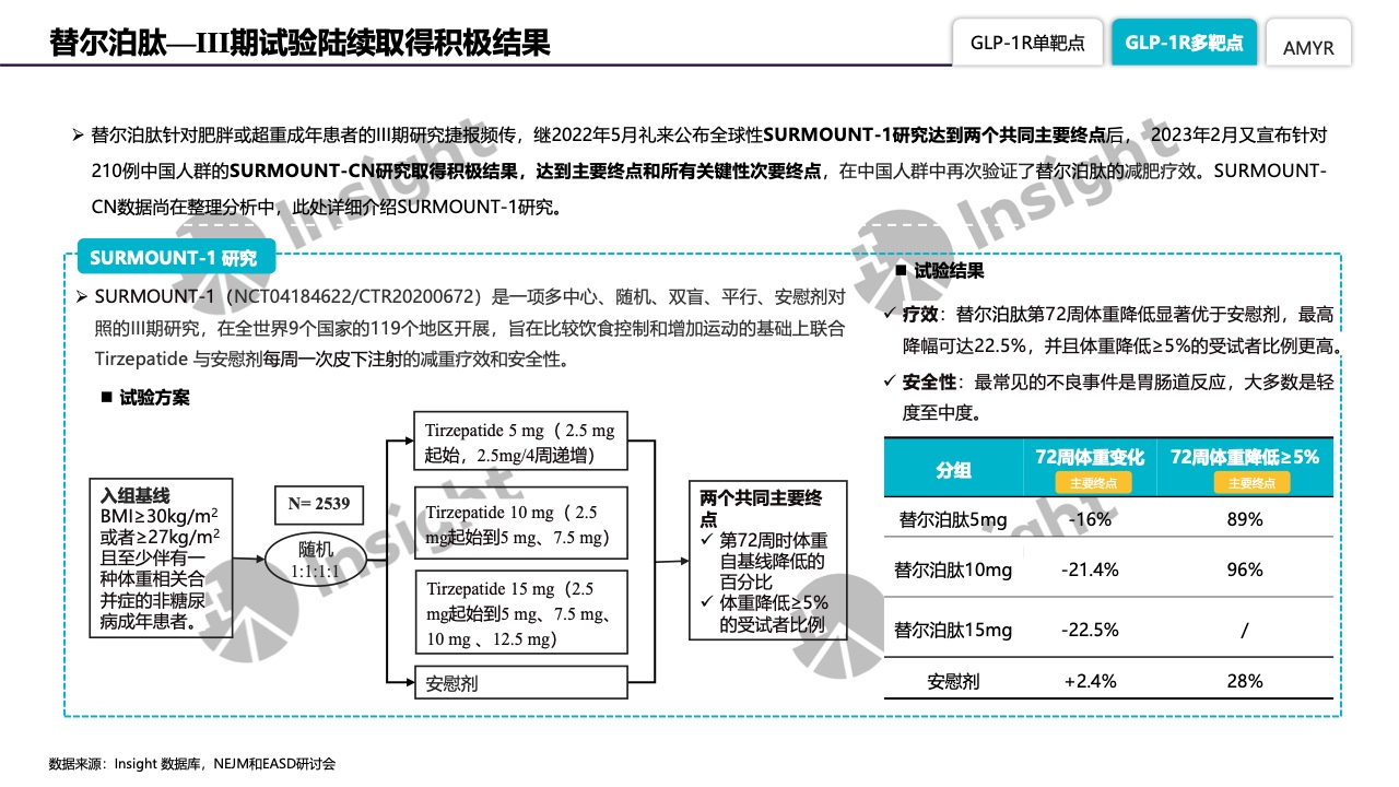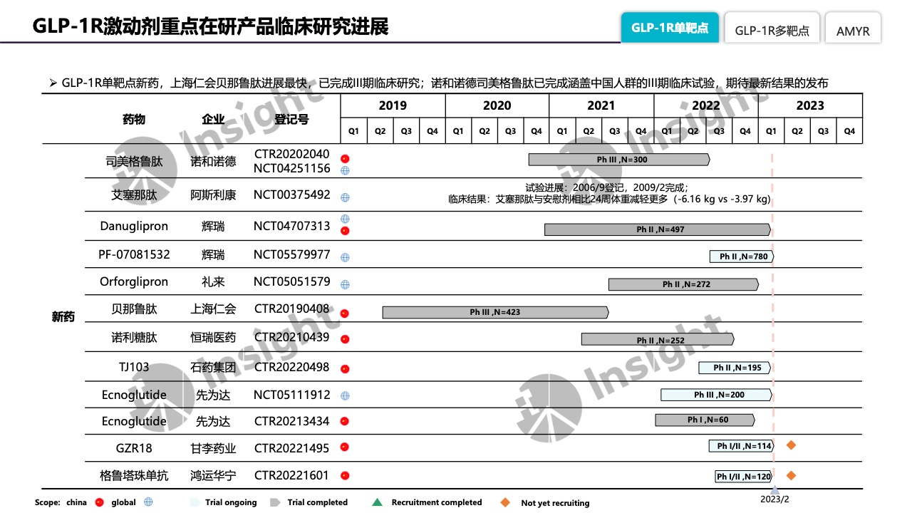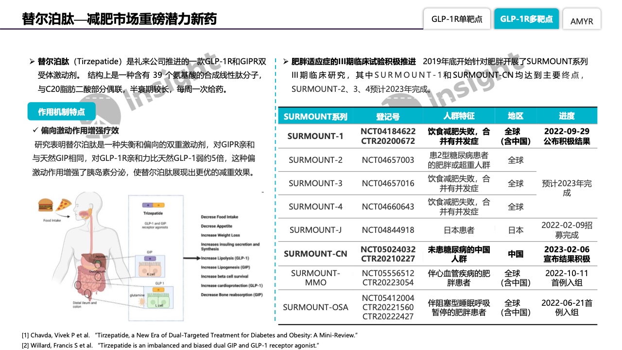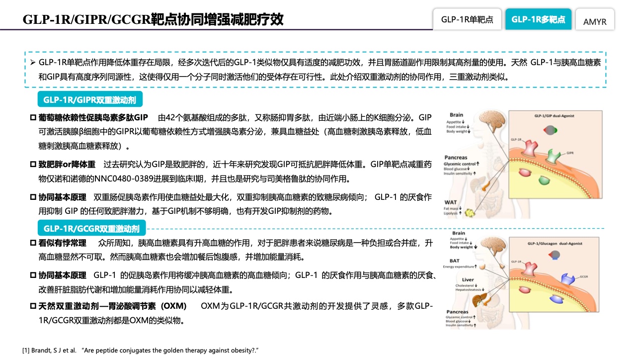 在 GLP-1R/GIPR 在双靶点领域,礼来替尔泊肽在中国的临床实践进展最高 III 最近,期测试取得了积极的结果。AMG133 是安进开发的潜在潜力「first-in-class」虽然双特异性抗体多肽偶联物的作用机制似乎与替尔泊肽矛盾,但它的作用机制似乎与替尔泊肽矛盾 I 临床数据显示,该药物也能起到减肥的作用。