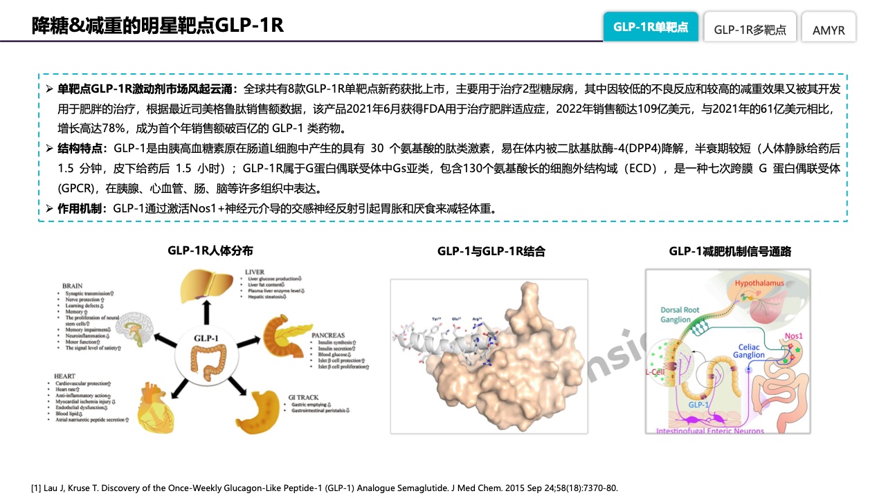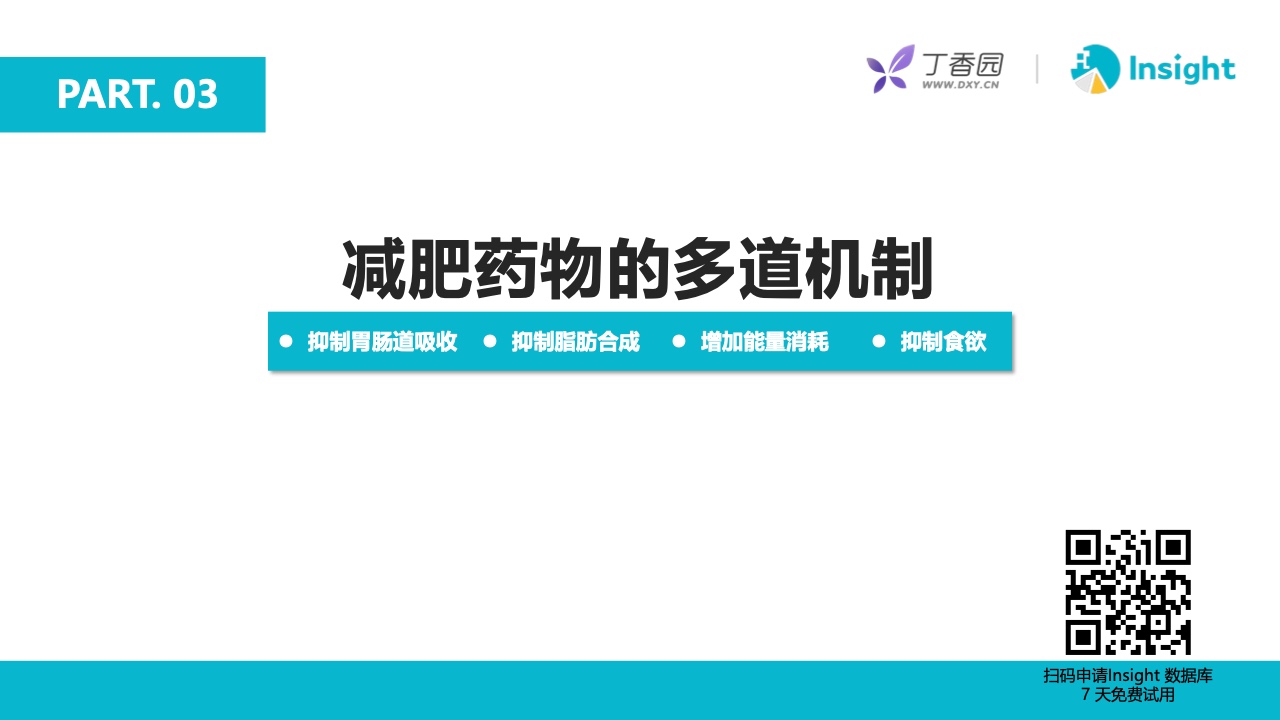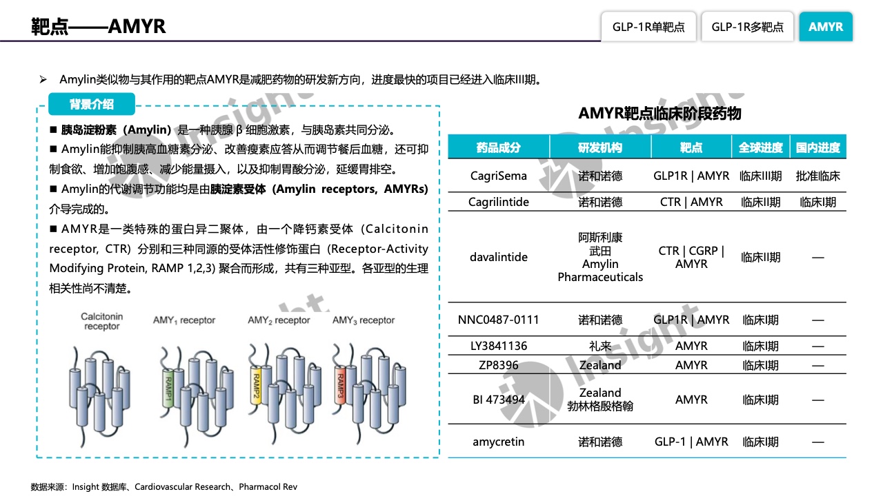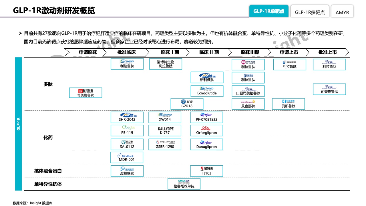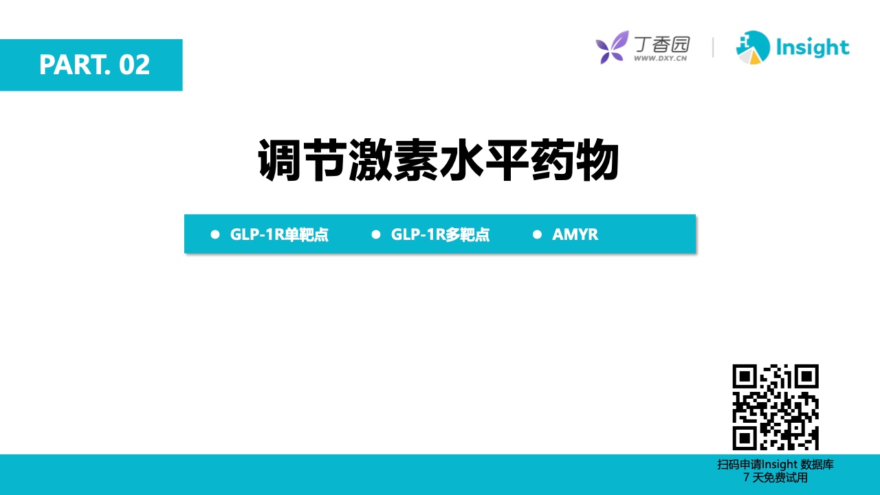 丁香园 Insight 数据库分析师团队专门撰写了数据库「肥胖治疗药物研究报告」,对 GLP-1 综合整理了相关药物,并介绍了其他可能用于减肥的潜在靶点。