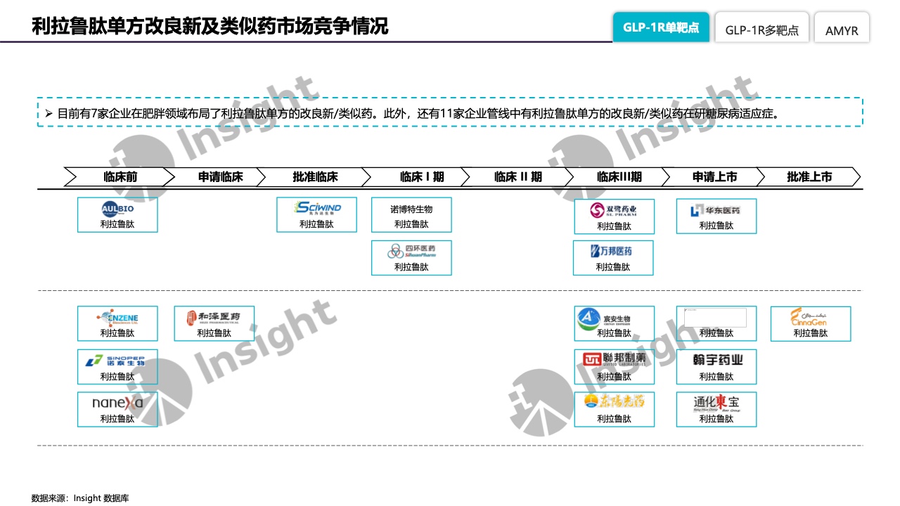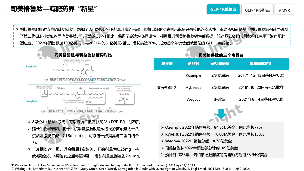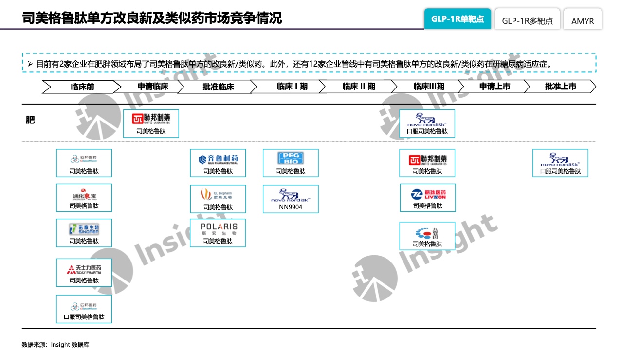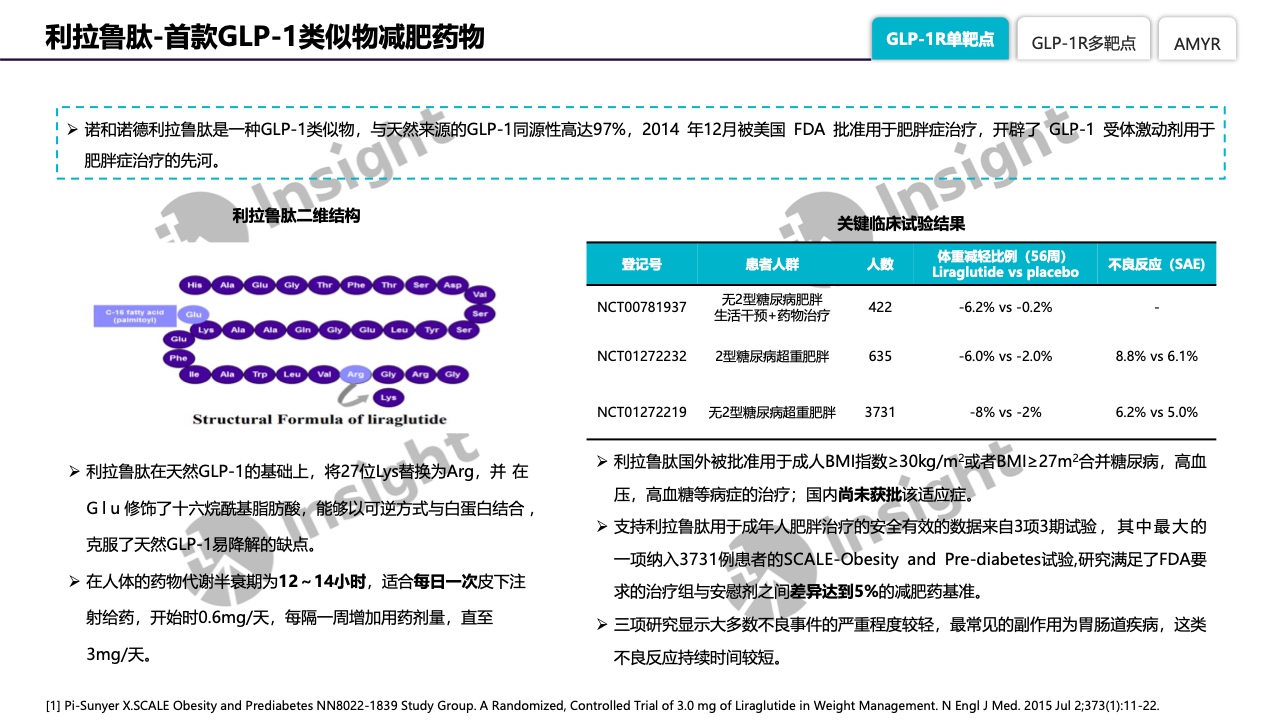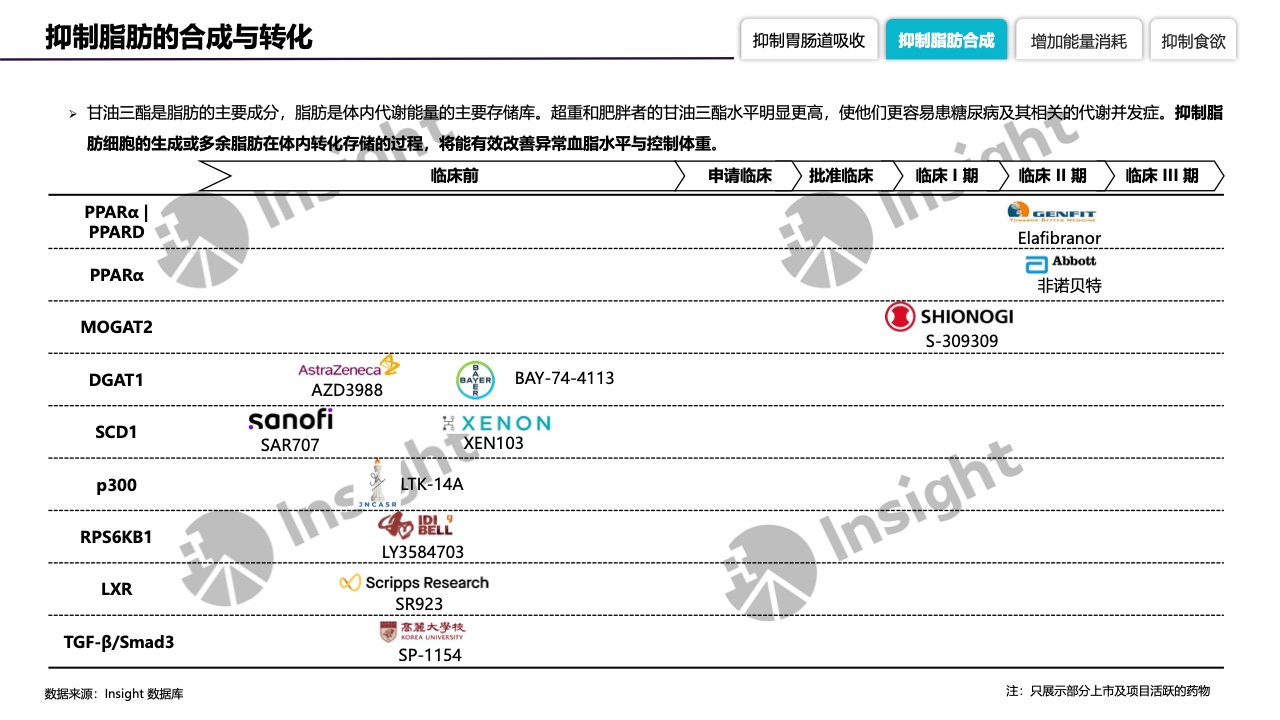丁香园 Insight 数据库分析师团队专门撰写了数据库「肥胖治疗药物研究报告」,对 GLP-1 综合整理了相关药物,并介绍了其他可能用于减肥的潜在靶点。