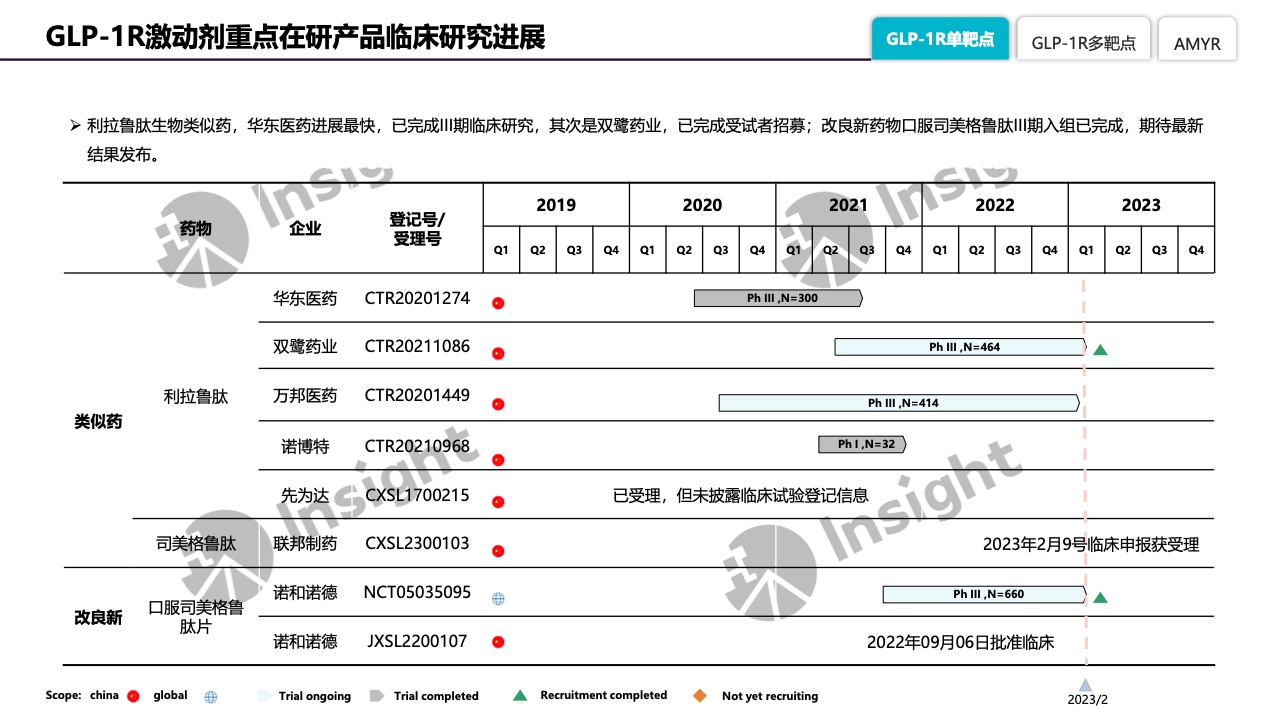 豪森制药、华东制药、鸿运华宁、硕迪生物等国内企业 GLP-1R/GIPR 有布局,目前正处于研发的早期阶段。此外,还有礼来三靶点药物 Retatrutide 计划于 2023 临床试验于年启动。