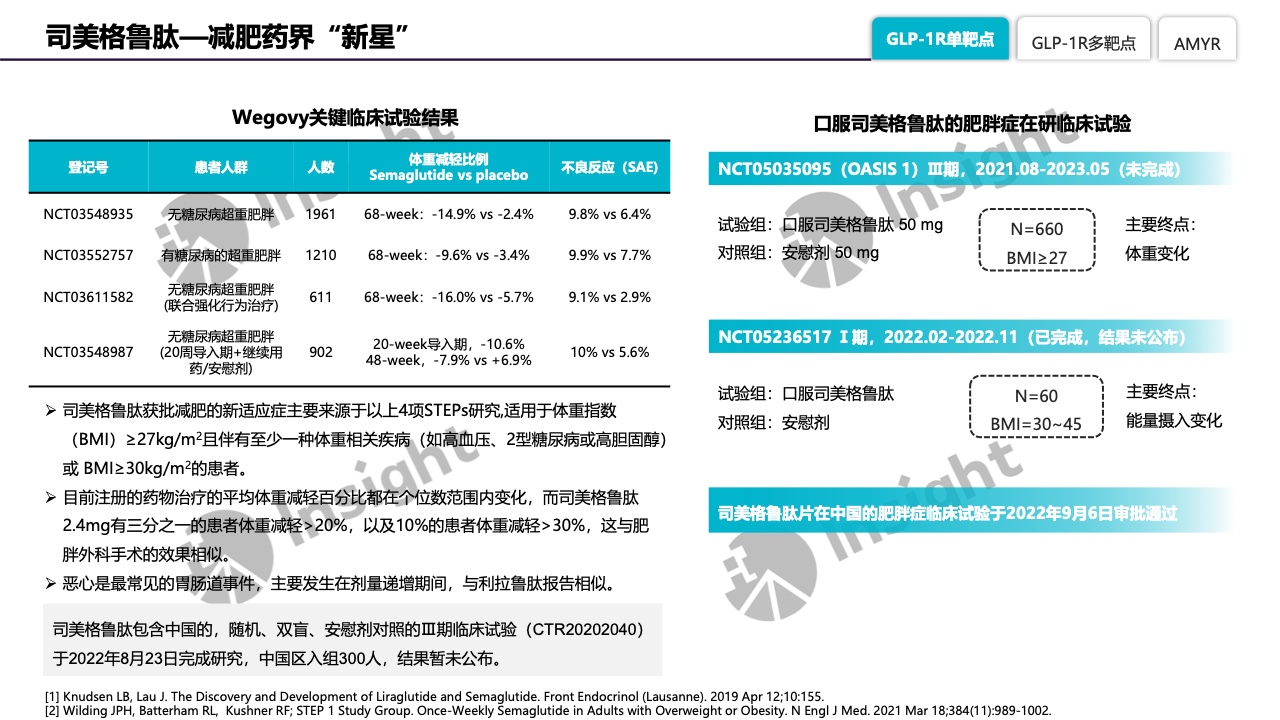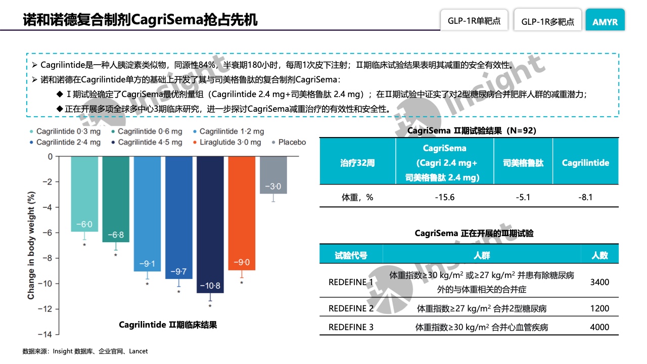 随着减肥领域明星靶点药物在临床研究和现实世界中得到越来越多的实证支持,预计肥胖患者的治疗需求将得到进一步满足。不仅如此,临床研究还表明,复方制剂和多靶点药物显示出超越单一靶点药物的潜力。有鉴于此,计划在这一领域取得巨大成就的中国企业需要在研发管道的布局上更具前瞻性,以赢得更多的先发优势。