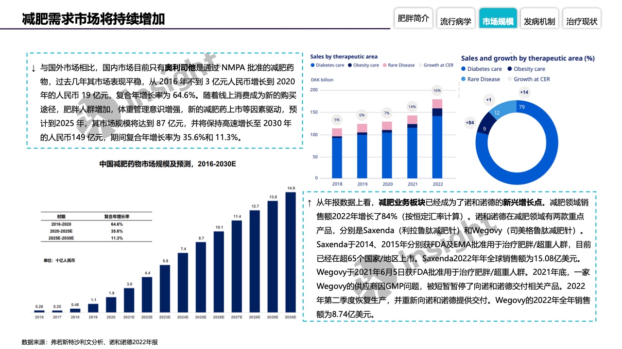 诺和诺德利拉鲁肽 2014 年 12 月被美国 FDA 批准用于肥胖治疗,开辟了肥胖治疗 GLP-1 肥胖治疗中首先使用受体激动剂。然后批准了第二代 GLP-1 与物司格美鲁肽类似,其体内半衰期进一步延长,有效提高了患者的治疗依从性。从年度报告数据来看,减肥业务已成为诺和诺德的新兴增长点。减肥领域的销售额 2022 年增长了 84%。