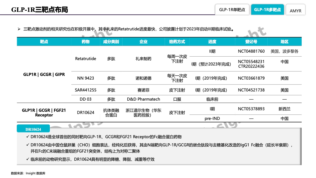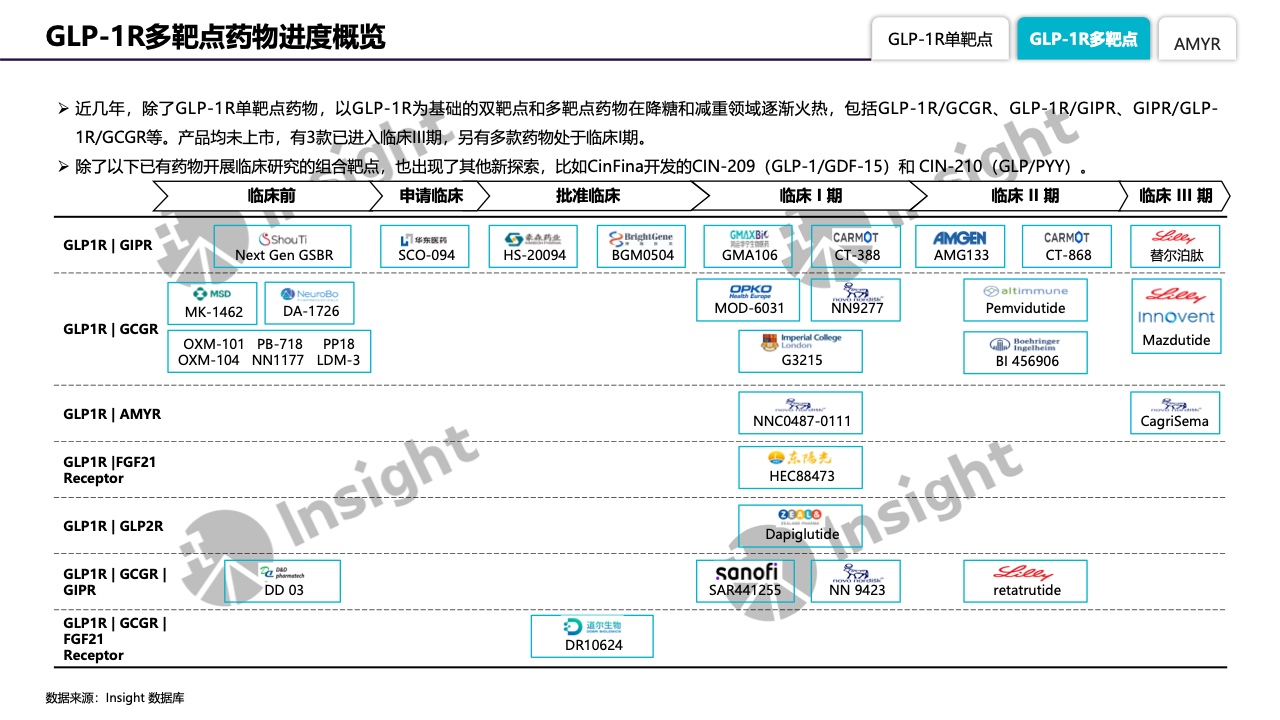 由于 GLP-1 经过多次迭代,单靶作用降低了体重的局限性。 GLP-1 类似物体只有适度的减肥效果,胃肠道副作用限制了其高剂量的使用。因此以 GLP-1R 双靶点和多靶点药物在降糖和减肥领域逐渐流行起来,包括 GLP-1R/GIPR、GLP-1R/GCGR、GIPR/GLP-1R/GCGR 等。所有产品都没有上市,是的 3 资金已进入临床 III 临床上还有许多其他药物 I 期。