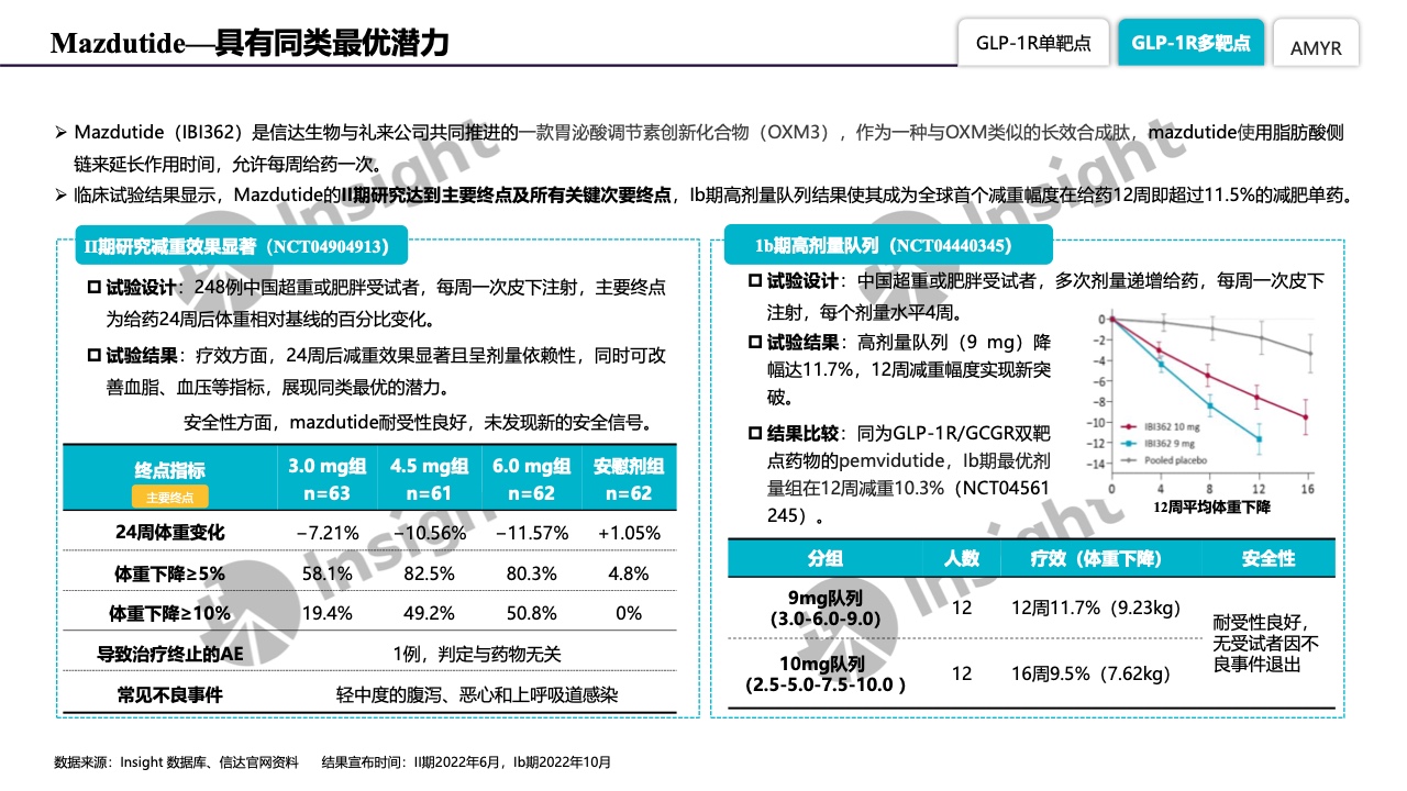 在 GLP-1R/GCGR 信达和礼来共同推进双靶点领域 mazdutide 全球领先的进步。该药物是一种创新的胃泌酸调节素化合物(OXM3),Ib 高剂量队列在给药中 12 体重下降超过一周 11.5%,II 期研究也达到了主要终点和所有关键次要终点。