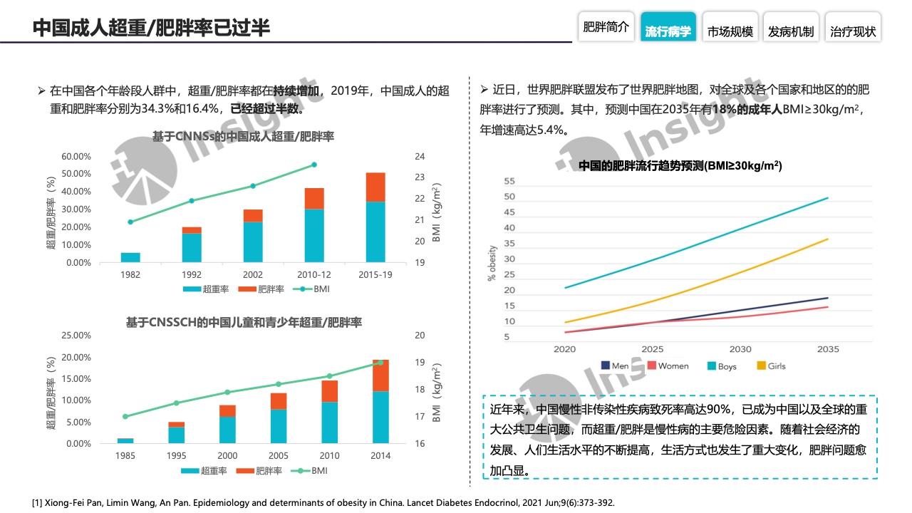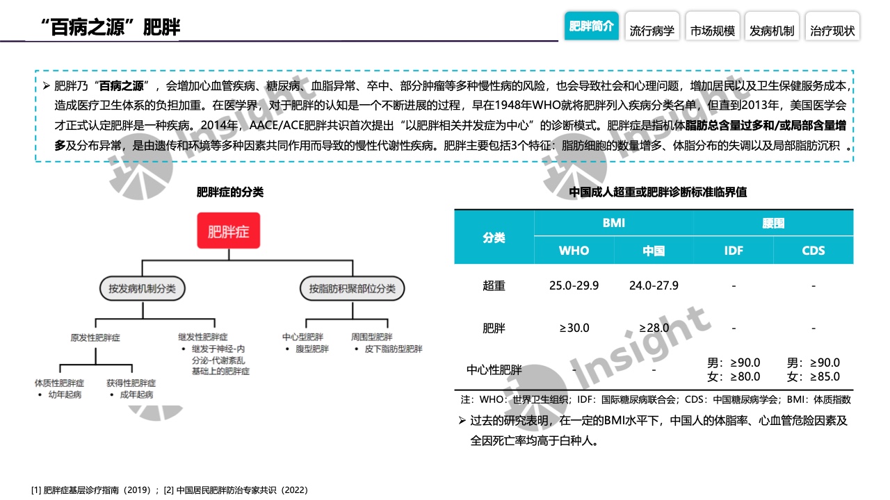 早在医学界,对肥胖的认识就是一个不断深化的过程 1948 年 WHO 肥胖被列入疾病分类名单,但直到 2013 2019年,美国医学会正式认定肥胖是一种疾病。 年数据显示,中国成年人超重肥胖率已超过一半,儿童和青少年超重肥胖率不容低估。这使得与肥胖相关的医疗保健支出逐年增加。