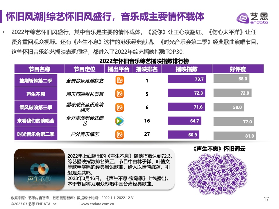 《声生不息》让观众重新认识经典港乐;《乘风破浪》 王心凌、任贤齐、苏有朋等。在《克服困难》中,凭借经典老歌再次走红。同时,综艺节目的运作更加细分,综艺节目的细分更加明显。关注母子solo的《我没谈过恋爱》,关注体育生的《闪耀吧!体育生,2023年将推出更多新的爱情形式。