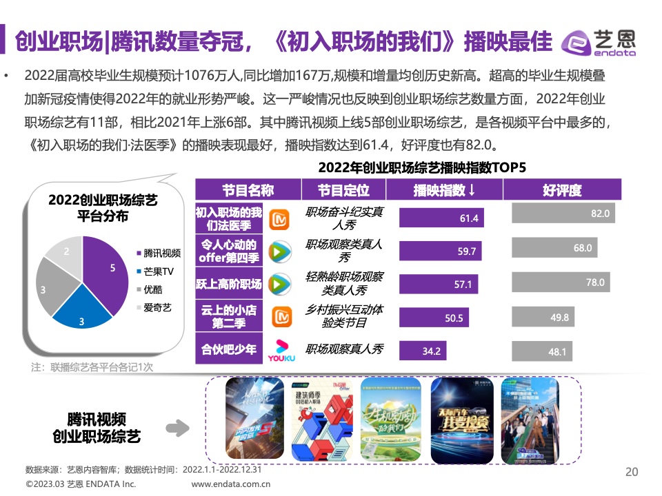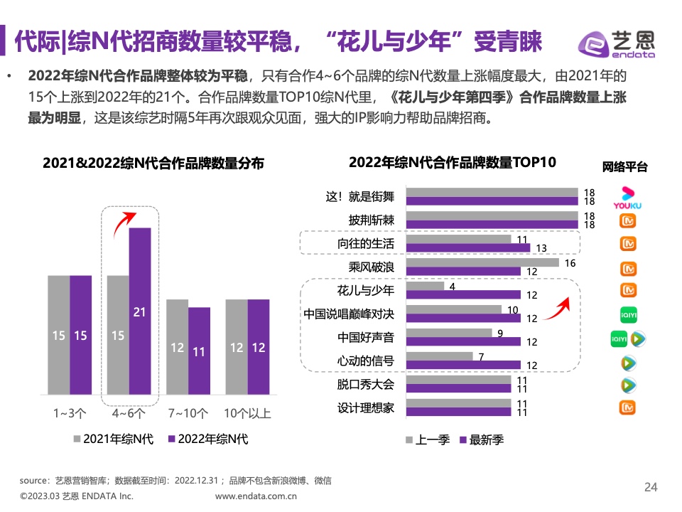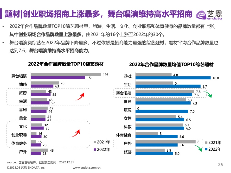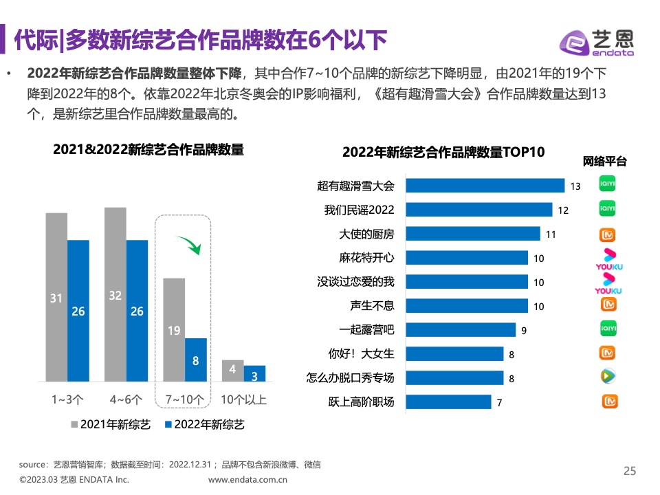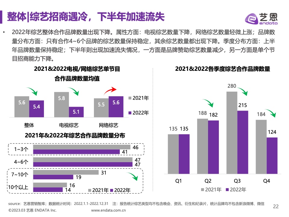 在综艺赞助市场方面,品牌方面更加谨慎,综艺投资冷淡。2022年,综艺节目整体合作品牌平均水平下降;主要品牌所有者更加谨慎,集中在N代综艺节目和电视综艺节目,新综艺节目的投资吸引力显著下降。虽然舞台歌唱综艺节目的投资吸引力继续领先,但合作品牌的数量显著下降。面对严峻的就业形势,创业工作场所综艺节目的数量正在上升,合作品牌的数量也在上升。