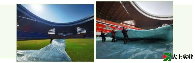 在三月上旬时草坪一片生机盎然,场地的防冻保暖措施就尤为重要,我们请来了专业的工作人员对比赛草坪进行了塑料布全场地覆盖,让草坪适应寒冷的天气。