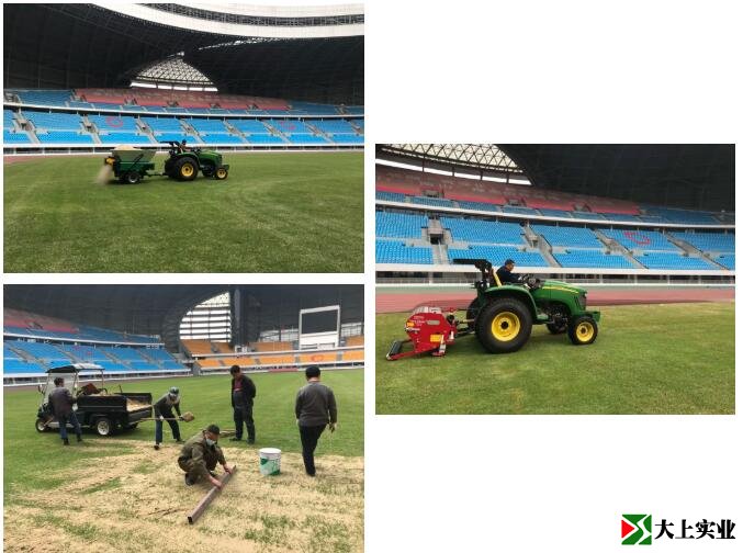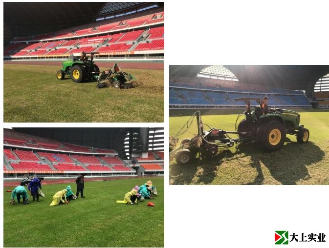 在三月下旬时对比赛草坪进行了疏草、打孔、覆沙、人工找平工作,来扩大土壤的表面积,增加土壤和大气的接触面积,促进气体交换,增加土壤的通气性、吸水性、透水性,同时改善草坪的土壤结构,控制枯草层,防止草坪草徒长。
