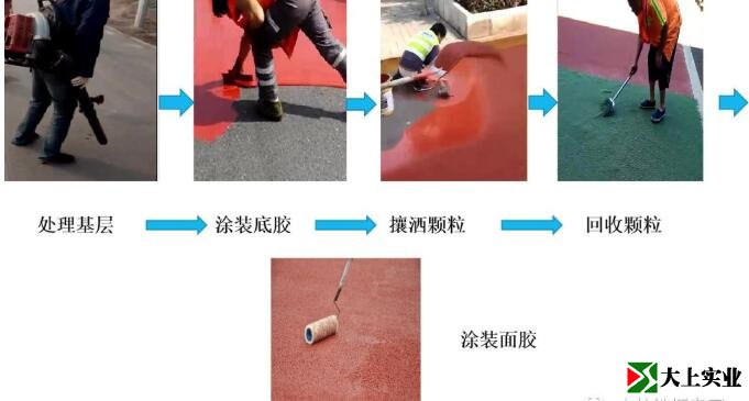 第四步,回收颗粒,攘撒防滑颗粒后,等待一小时,检查底胶是否完全固化。此时防滑颗粒应被底胶牢牢的附着在地面上。先用扫把和吹风机等工具将表面松散颗粒打扫干净并回收,然后使用铁片铁耙类工具在颗粒层上反复刮动,将粘结较浅的颗粒刮下来。