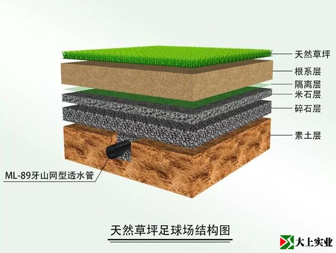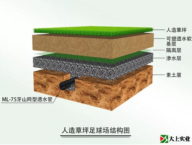基于环境保护和运动安全考虑,大上实业总结了天然草坪及棒球场红土层做法,发明了一种可塑透水软基础结构及施工方法,该可塑透水软基础透水性好(无积水现象)、可塑性好(平整度容易控制)、硬度适中(接近天然草坪足球场硬度)。同时,若想把人造草坪改成天然草坪,只需清除掉人造草坪面层,对原有基础简单处理,便可直接种植天然草坪,实现了人造草坪和天然草坪之间的自由切换,简单、方便、耗资少。