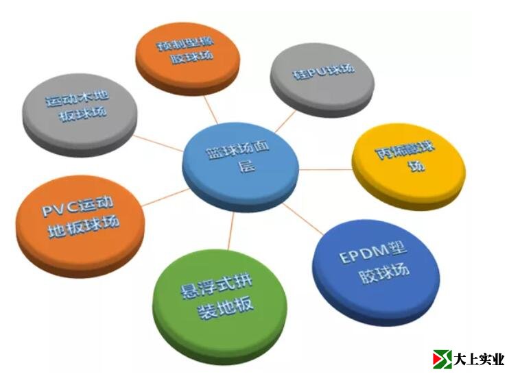 实际上了解篮球场的面层材料的人就更少了,今天大上实业小编就通过一张图介绍篮球场面层材料的分类,再详细论述各种材料面层的特点,让您对如何选择篮球场面层材料做到心中有数。羽毛球场、排球场等也可参照这些标准选择。