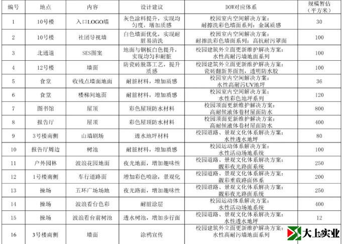 1、校园室内空间解决方案主要是我们的耐擦洗彩色墙面系列,它有金属质感、高抗清漆的特点,主要应用于3号楼南侧涂鸦墙、社团导视墙、10号楼入口LOGO墙。