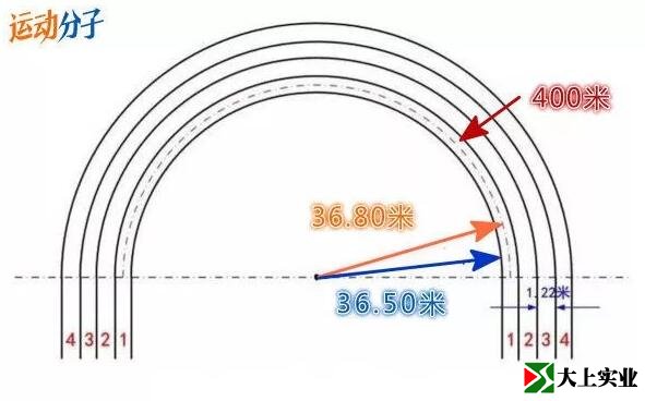 02 弯道半径弧度是36.5米,直道的长度则是84.39米。(π × 36.5米+84.39米)× 2=498.116米就是标准体育场内圈(第一道)内圈线的距离,比400的“标准”短了差不多两米。目前世界上大型场馆的田径跑道都是以这个标准修整的。