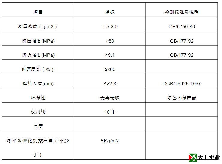 停车位采用(马贝牌或巴斯夫牌)非金属骨料金刚砂(铬绿色),行车道采用(马贝牌或巴斯夫牌)非金属骨料金刚砂(重庆灰色)以上部位均涂抹马贝牌钠基密封固化剂.金刚砂用量不低于每平方0.5KG,密封固化剂用量不低于每平方0.2KG。 2.2、机械性能要求: