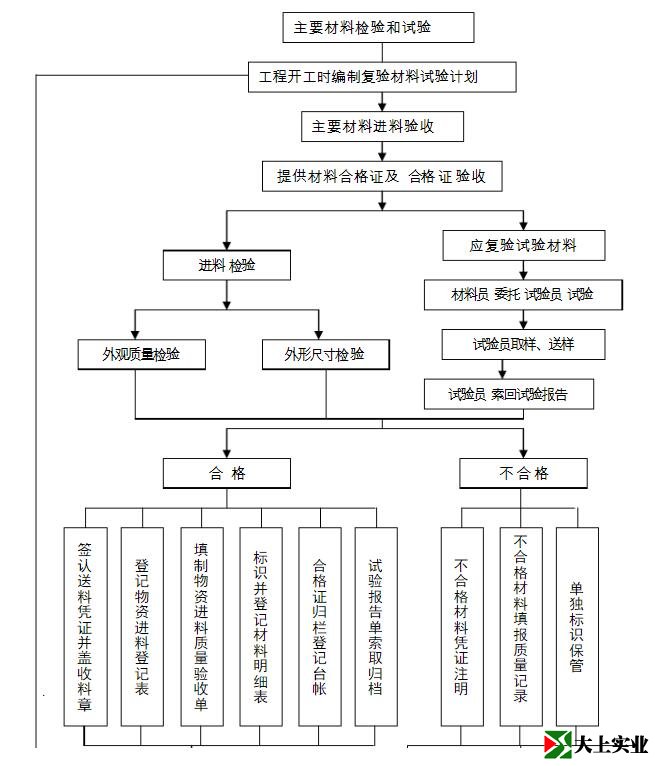 2、工程材料进场实行复检制度,材料进场时由材料员、质检员、现场试验员共同验收,查验出厂合格证,对原材料、半成品进行外观检验,并按照有关规定进行取样复试,只有经过复检合格的材料方可使用,杜绝使用不合格材料。