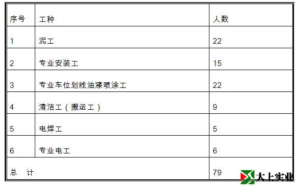 3、根据本工程实际情况,按照专业、高效选择施工队伍参与工程施工原则,整个工程拟安排车库地坪、标志、标牌、标线、设备安装、综合专业施工队共六个。各专业施工队按照