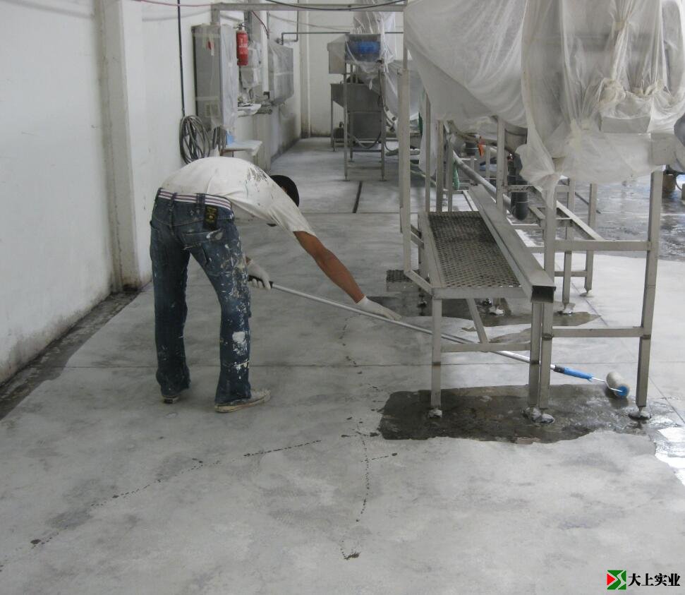 清扫完成后,我们将环氧面漆涂在砂浆层上。我们使用滚筒涂抹面漆,消耗量是在一般平地板上使用时的2倍左右。消耗量如此之高的原因是这个地板比较陈旧,质量较差。