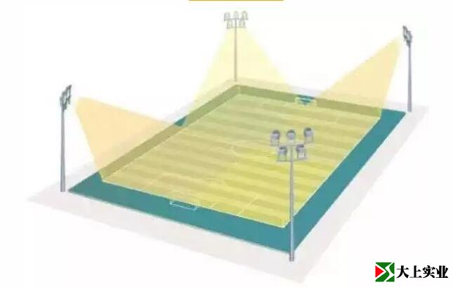 足球场地的布灯方式分为四角布灯和两侧布灯两种方式。
