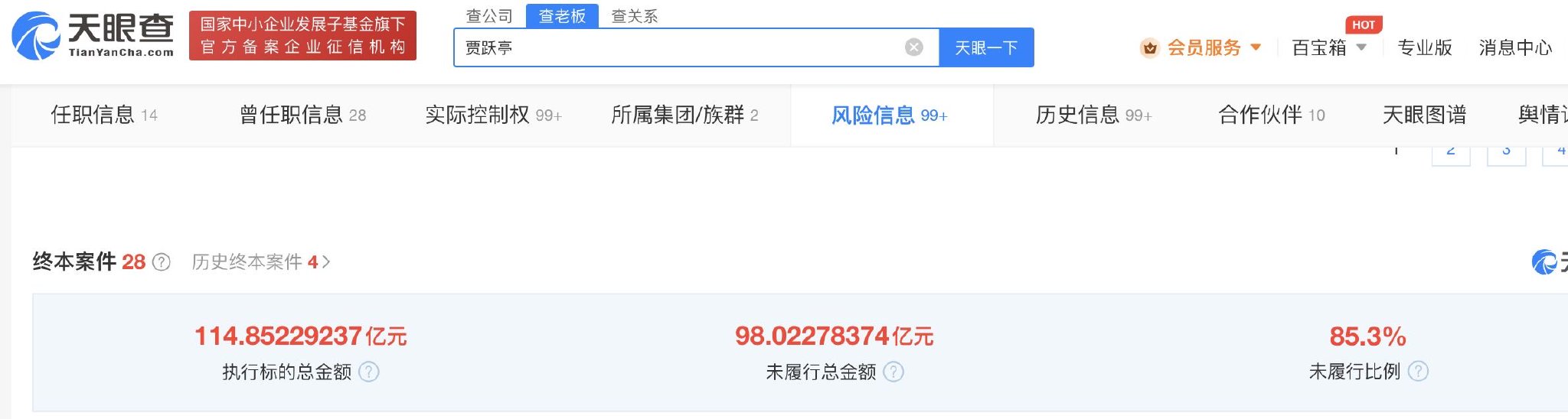 围绕贾跃亭的麻烦也不断。天眼查App显示,贾跃亭目前仍关联4条被执行人信息,被执行总金额超22亿,另外未履行总金额超98亿。所持多家公司股权也已被冻结。