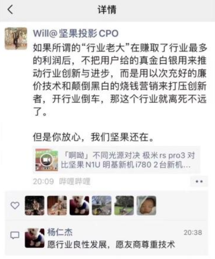 首先是坚果投影CPO(首席产品官)Will在朋友圈发文,怒斥极米科技“开行业倒车”,极米科技公关也在朋友圈隔空喊话,说坚果“硬要碰瓷营销”。