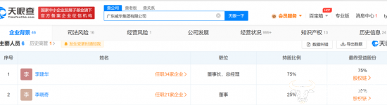值得一提的是,据天眼查显示,李剑明并没有威华集团的股份,目前是李建华持股75%,李晓奇持股25%。虽然威华集团并未官方说明李建华、李剑明等人的信息,但通过年龄、经历等可以推测,李建华是李剑明的哥哥,他们二人相差14岁,刘宪是威华集团原总经理,应该是李建华的妻子,刘宪比李建华小1岁,不过遗憾的是,刘宪在2013年6月因病离世。