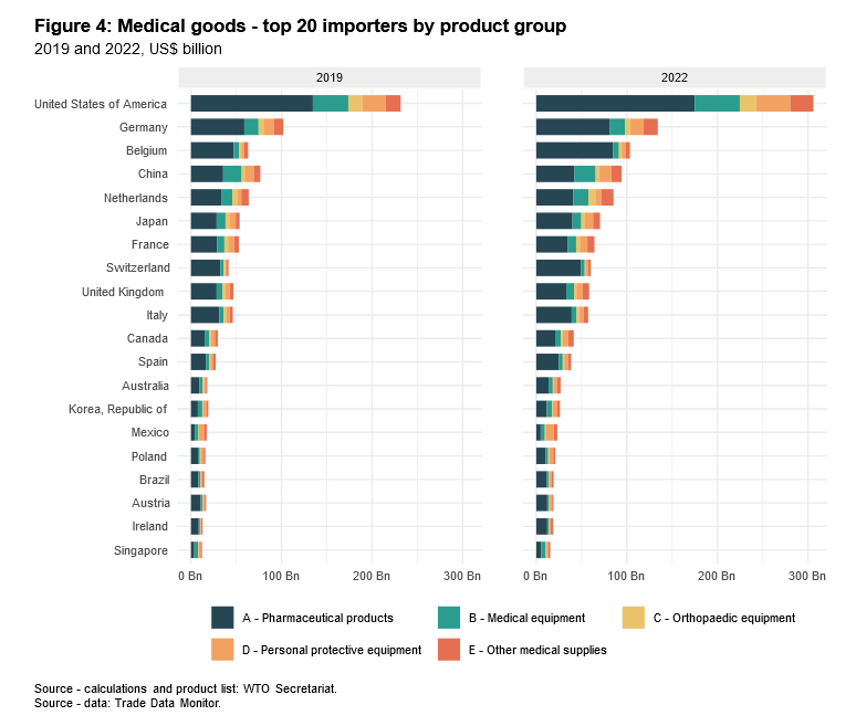 比利时和瑞士在2019年和2022年之间的排名位置略有提高,主要是由于其医药产品的进口增加。其他主要进口国的排名保持相对稳定。