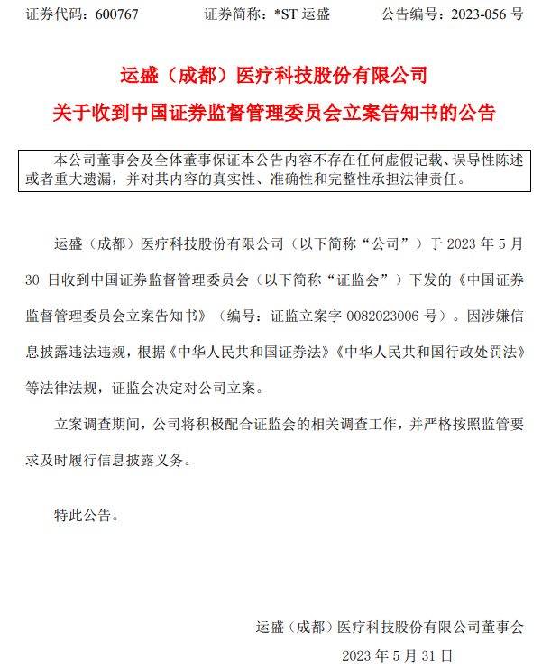 红星资本局5月31日消息,运盛医疗(600767.SH,即退市运盛)于5月30日晚间公告,因涉嫌信披违法违规,中国证监会决定对公司立案。同时,运盛医疗还公告将于5月31日进入退市整理期交易,预计最后交易日为6月20日。