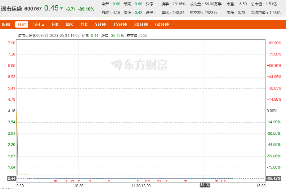 5月31日开盘,运盛医疗触及盘中临时停牌,根据上交所相关交易规则,上交所决定自9时30分开始暂停其交易,9时40分起恢复交易。截至收盘,运盛医疗跌89.18%,报0.45元/股,总市值1.53亿元。