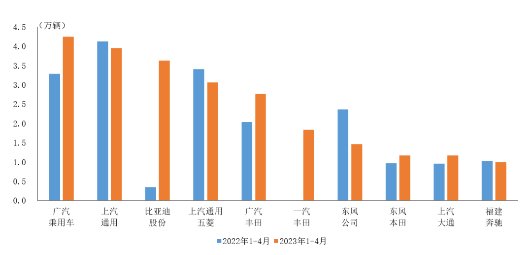 在上述十家企业中,与上年同期相比,广汽乘用车、比亚迪股份、广汽丰田、一汽丰田、东风本田和上汽大通销量呈明显增长,其他企业呈不同程度下降。