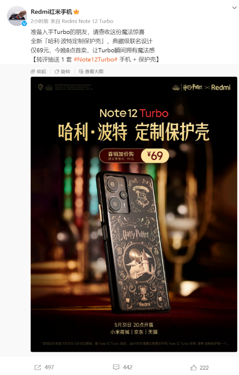IT之家 5 月 31 日消息,Redmi 红米手机微博表示,Redmi Note 12 Turbo 手机官方全新「哈利・波特定制保护壳」已推出,建议零售价 99 元,5 月 31 日-6 月 18 日期间随 Redmi Note 12 Turbo 手机购买,加价 69 元可获得该定制保护壳一个。