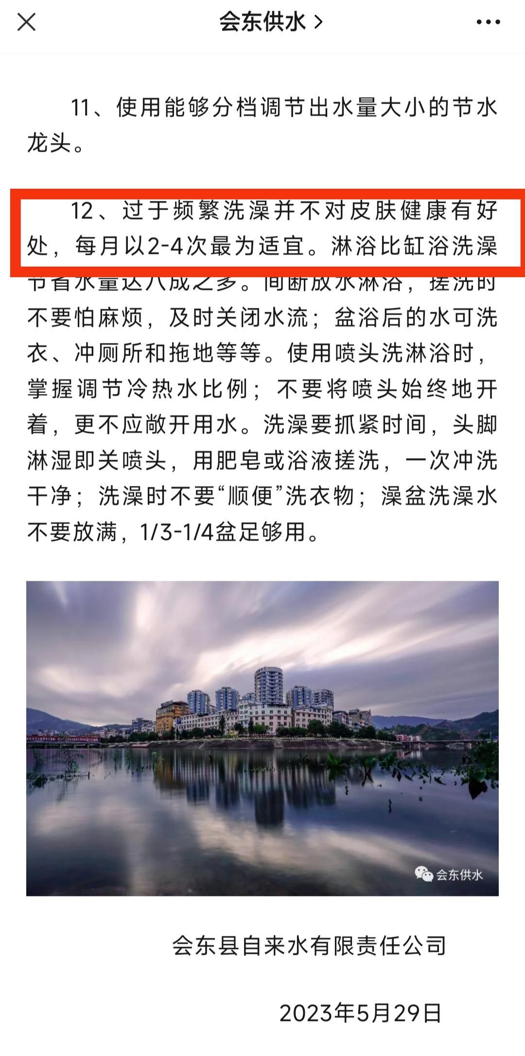 连日来,四川凉山州出现持续晴热高温天气,受高温少雨天气影响,凉山州会东县城镇居民生活饮用水水源告急。5月29日,当地自来水公司发出了呼吁广大市民节约用水的通知,可内文中一条“过于频繁洗澡并不对皮肤健康有好处,每月以2-4次最为适宜”的建议,引发了市民热议,还登上了热搜。