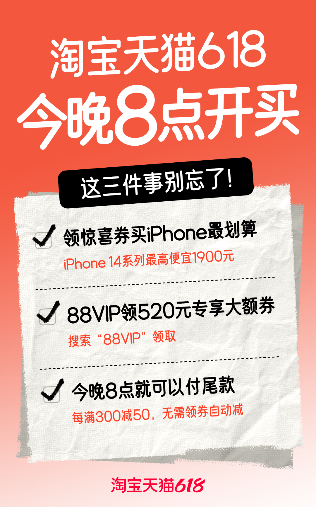 5月31日,记者获悉,今晚8点淘宝天猫618正式开卖,天猫再度加码苹果惊喜券,iPhone 14系列产品最高立省1900元。