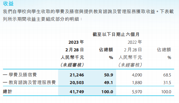 财报显示,截至2023年2月28日止六个月,博骏教育实现收益4174.9万元,和上年同期的597万元相比增长近600%。其中,学费及膳宿费为2124.6万元,上年同期为409万元。教育咨询及管理服务费为2050.3万元,上年同期为597万元。对于收益的增长。公司主要提到了学生总数的增长。报告期内,博骏教育旗下高中入学人数同比增长281.5%至576名,更重要的是,河滨幼儿园及丽都幼儿园注册为营利性幼儿园,两所幼儿园的学生总数为278名。截至2023年2月28日,公司学生总人数为854名,而上年同期仅有151名。此外,公司整体校园利用率只有46.8%,学生人数增长的空间较大。