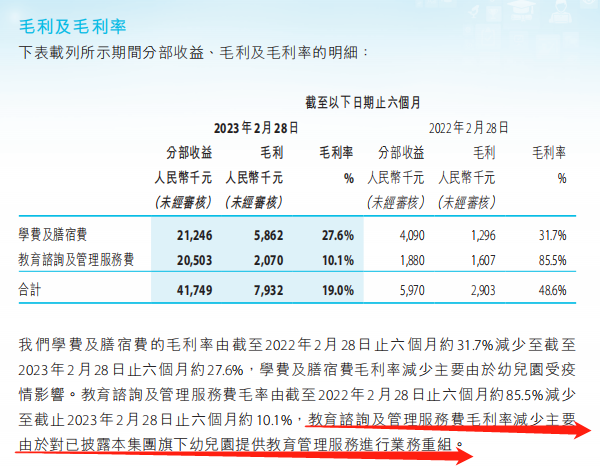 但曾经因为毛利率较高而被认为市场增长空间较大的教育咨询及管理业务,在报告期内的毛利率却由上年同期的85.5%降至10.1%,出现了异常的下降。对此,公司只在财报中简单提及“由于对已披露集团旗下幼儿园提供教育管理服务进行业务重组”,并未透露更具体的原因。