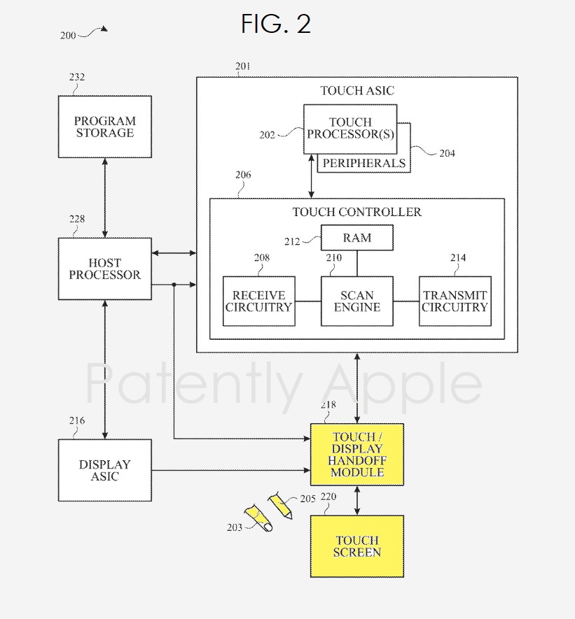 触控屏幕#200 集成触控屏#220,可以显示图像并检测来自触摸屏表面或靠近触摸屏表面的物体(例如#203 的手指和# 205 的 Apple Pencil 等手写笔)。