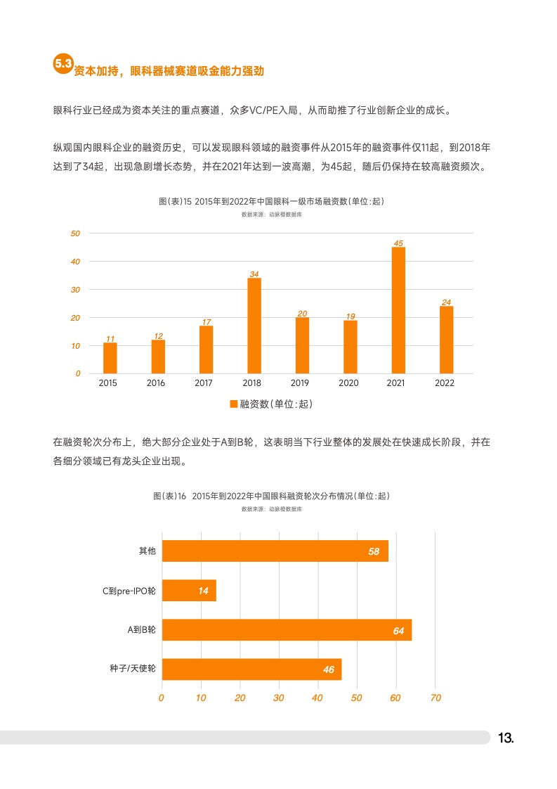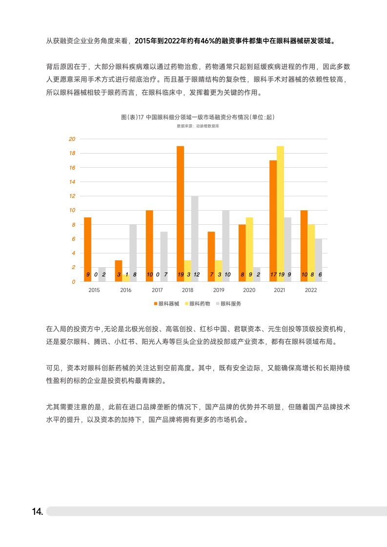 从获融资企业业务角度来看,2015年到2022年约有46%的融资事件都集中在眼科器械研发领域。