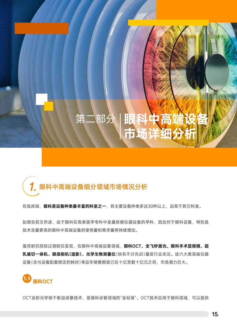 蛋壳研究院经过调研后发现,在眼科中高端设备领域,眼科OCT、全飞秒激光、眼科手术显微镜、超乳玻切一体机、眼底相机﹙造影﹚、光学生物测量仪﹙排名不分先后﹚最受行业关注。这六大类高端仪器设备﹙含与设备配套绑定的耗材﹚单品年销售额皆已在十亿至数十亿元之间,市场潜力巨大。