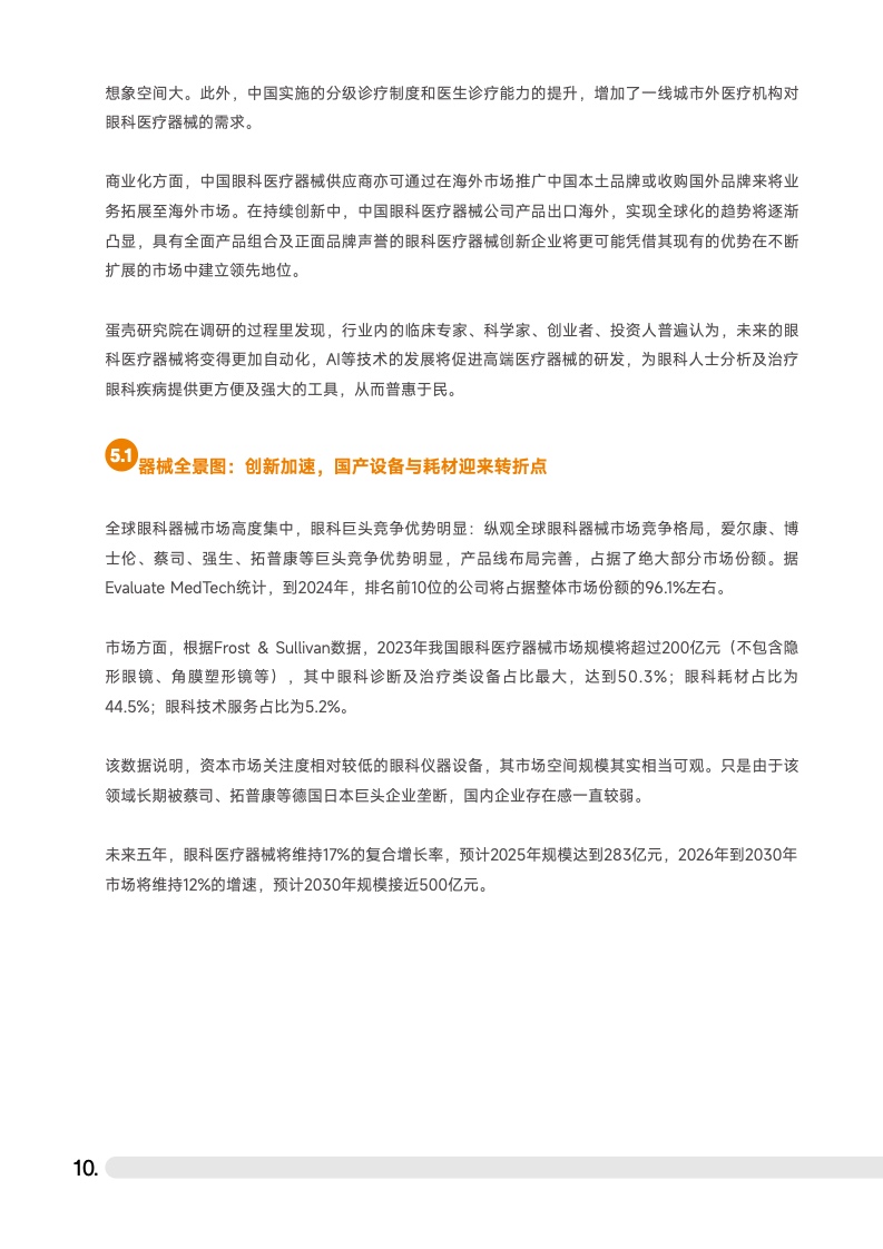 未来五年,眼科医疗器械将维持17%的复合增长率,预计2025年规模达到283亿元,2026年到2030年市场将维持12%的增速,预计2030年规模接近500亿元。